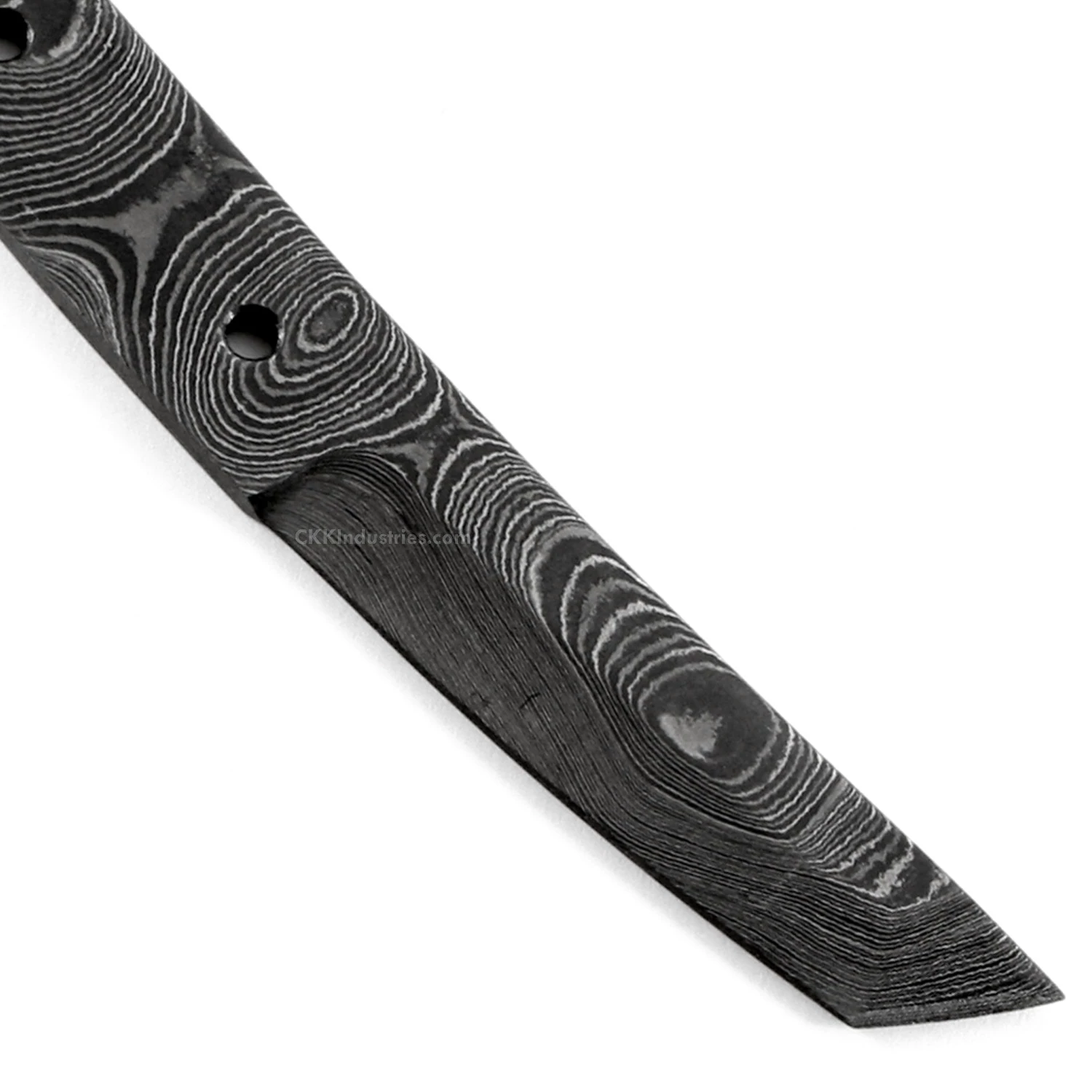 This damascus Japanese tanto knife kit design is called the “Makoto”. It is a USA Made carbon steel damascus fixed blade knife blank that is hollow-ground and ready to build. This design is scaled-down for easy use and carry comfort. The Makoto Japanese tanto knife kit has a blade length of 2.375 inches and an overall length of 6.187 inches. Ground on both sides, the blade is 0.750 inches wide. This tanto blade blank design features (3) .156 inch through-holes for handle construction (stainless steel pinstock included). The tang holes can be modified with ease to work with larger pinstock, or with threaded fasteners. Please see our parts and tools sections for more options. This version of the Makoto is the combo kit. It comes with the Makoto blade plus Curly Maple handle scales and stainless steel pinstock to simplify the completion process. This is a great project blade for a weekend knife making session. Spend some quality workshop time with this skinning knife kit and enjoy the fun of custom knife making and customization.