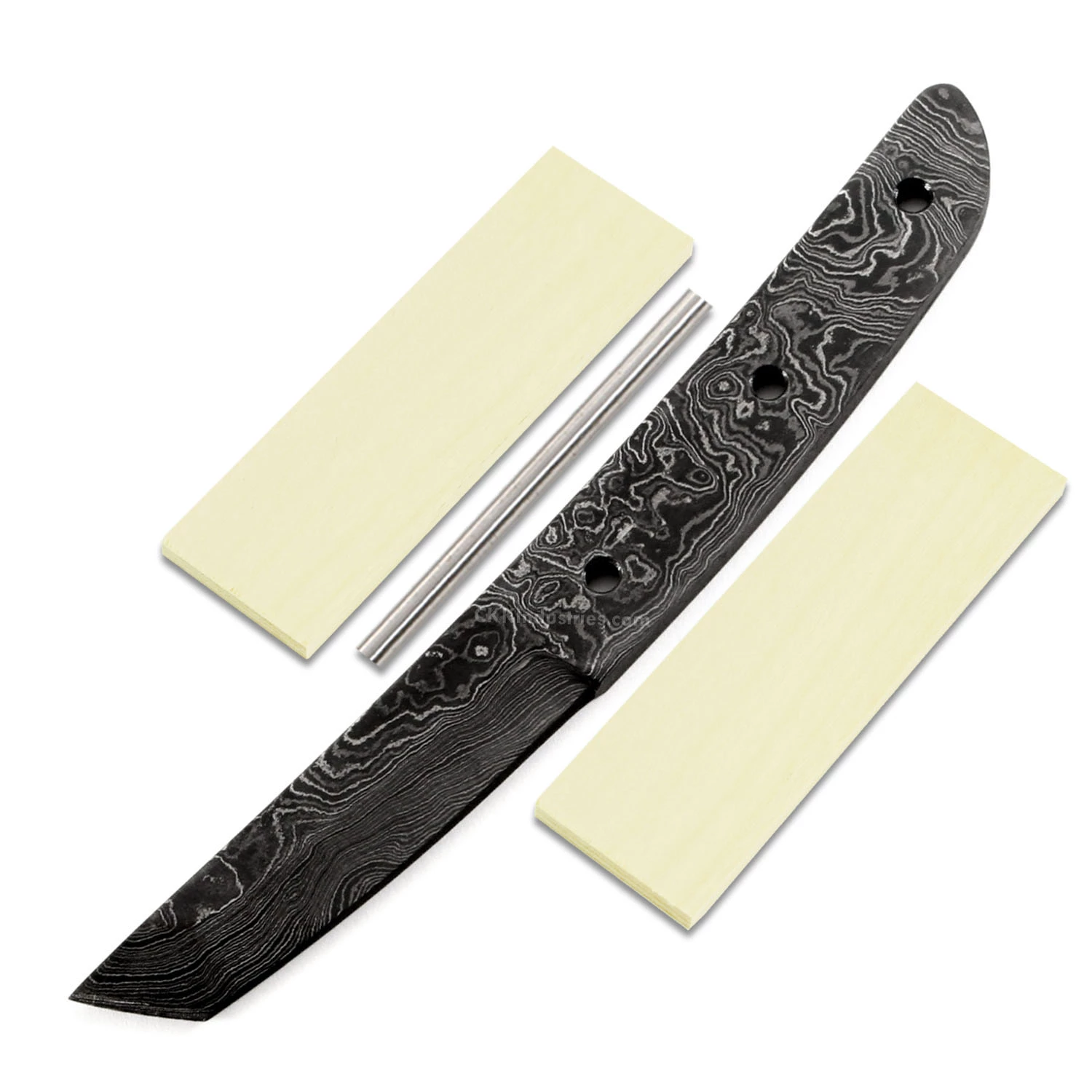 This damascus Japanese tanto knife kit design is called the “Makoto”. It is a USA Made carbon steel damascus fixed blade knife blank that is hollow-ground and ready to build. This design is scaled-down for easy use and carry comfort. The Makoto Japanese tanto knife kit has a blade length of 2.375 inches and an overall length of 6.187 inches. Ground on both sides, the blade is 0.750 inches wide. This tanto blade blank design features (3) .156 inch through-holes for handle construction (stainless steel pinstock included). The tang holes can be modified with ease to work with larger pinstock, or with threaded fasteners. Please see our parts and tools sections for more options. This version of the Makoto is the combo kit. It comes with the Makoto blade plus Yellowheart handle scales and stainless steel pinstock to simplify the completion process. This is a great project blade for a weekend knife making session. Spend some quality workshop time with this knife kit and enjoy the fun of custom knife making and customization.