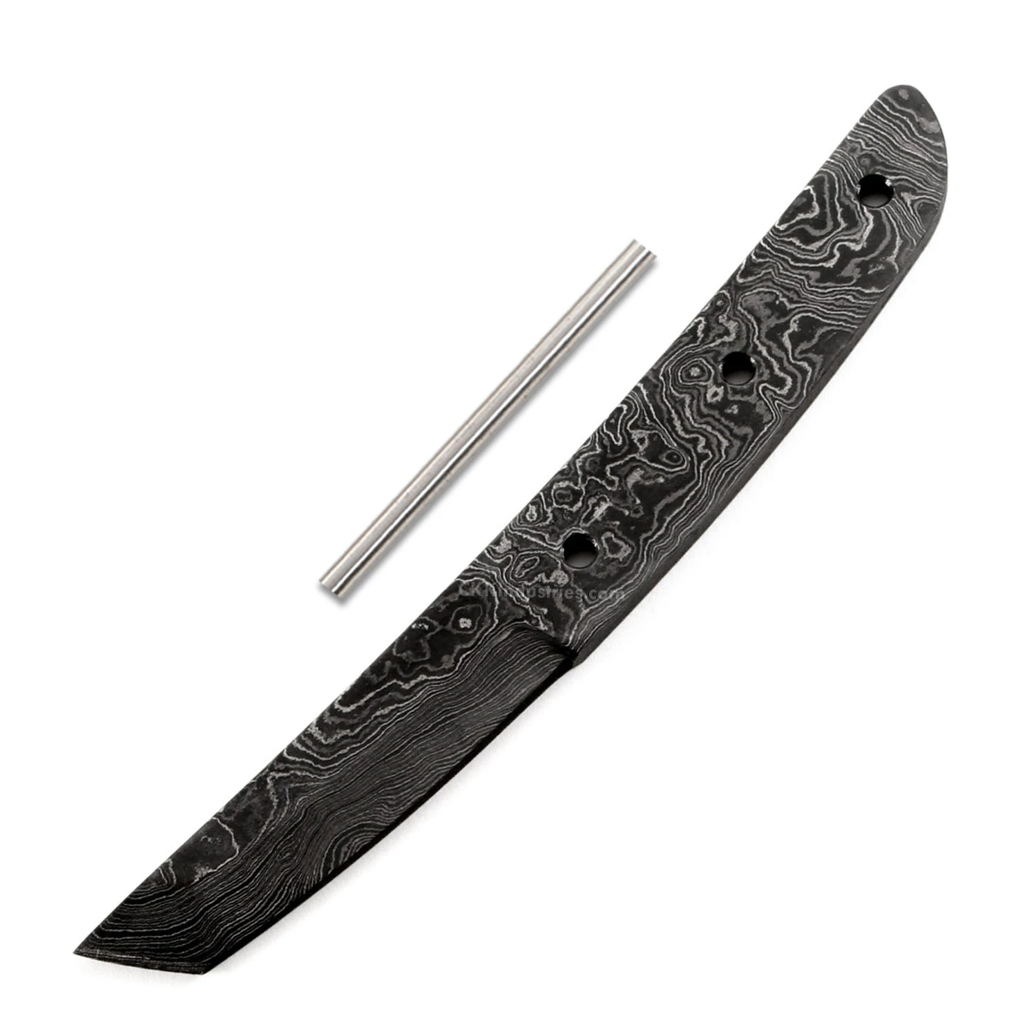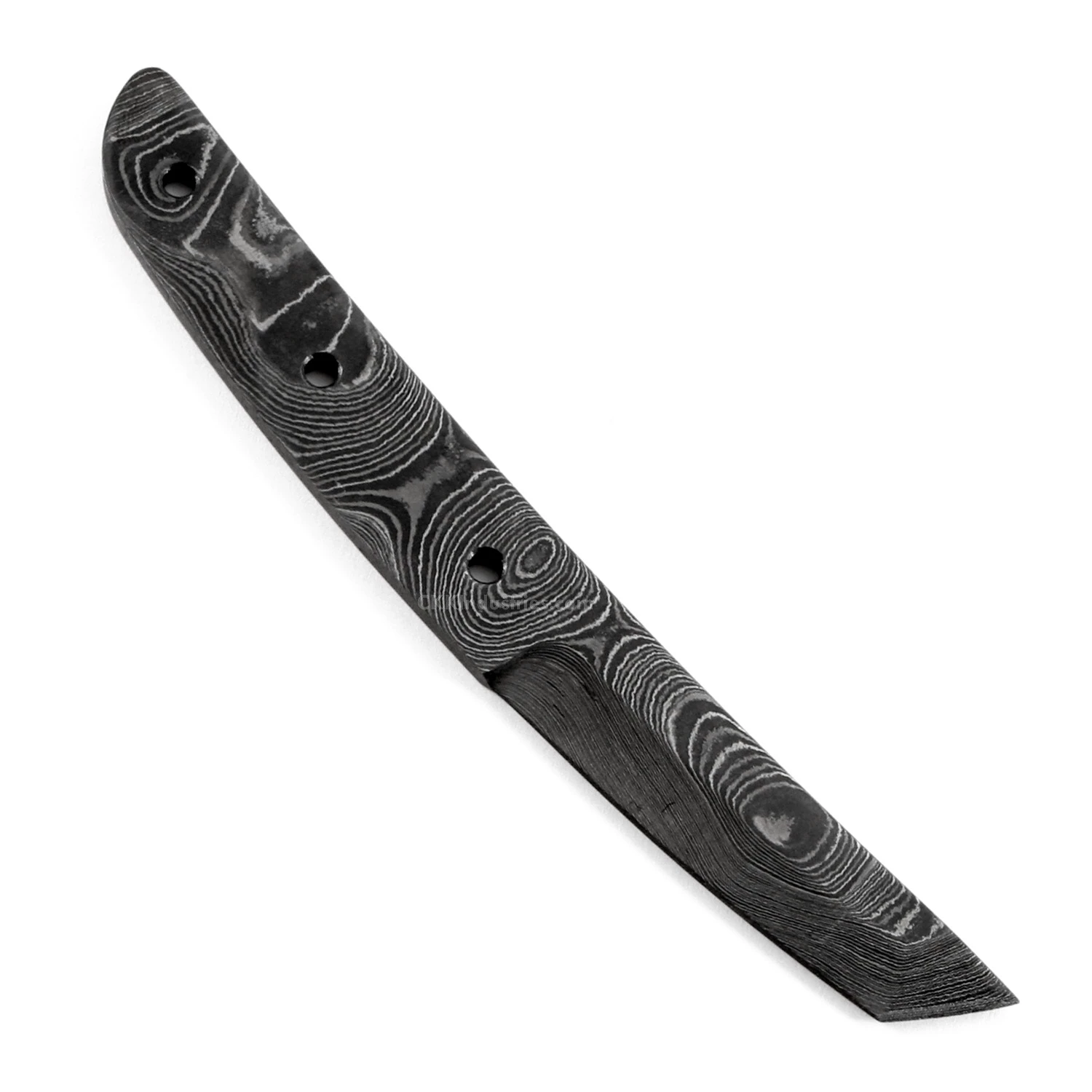 This damascus Japanese tanto knife kit design is called the “Makoto”. It is a USA Made carbon steel damascus fixed blade knife blank that is hollow-ground and ready to build. This design is scaled-down for easy use and carry comfort.