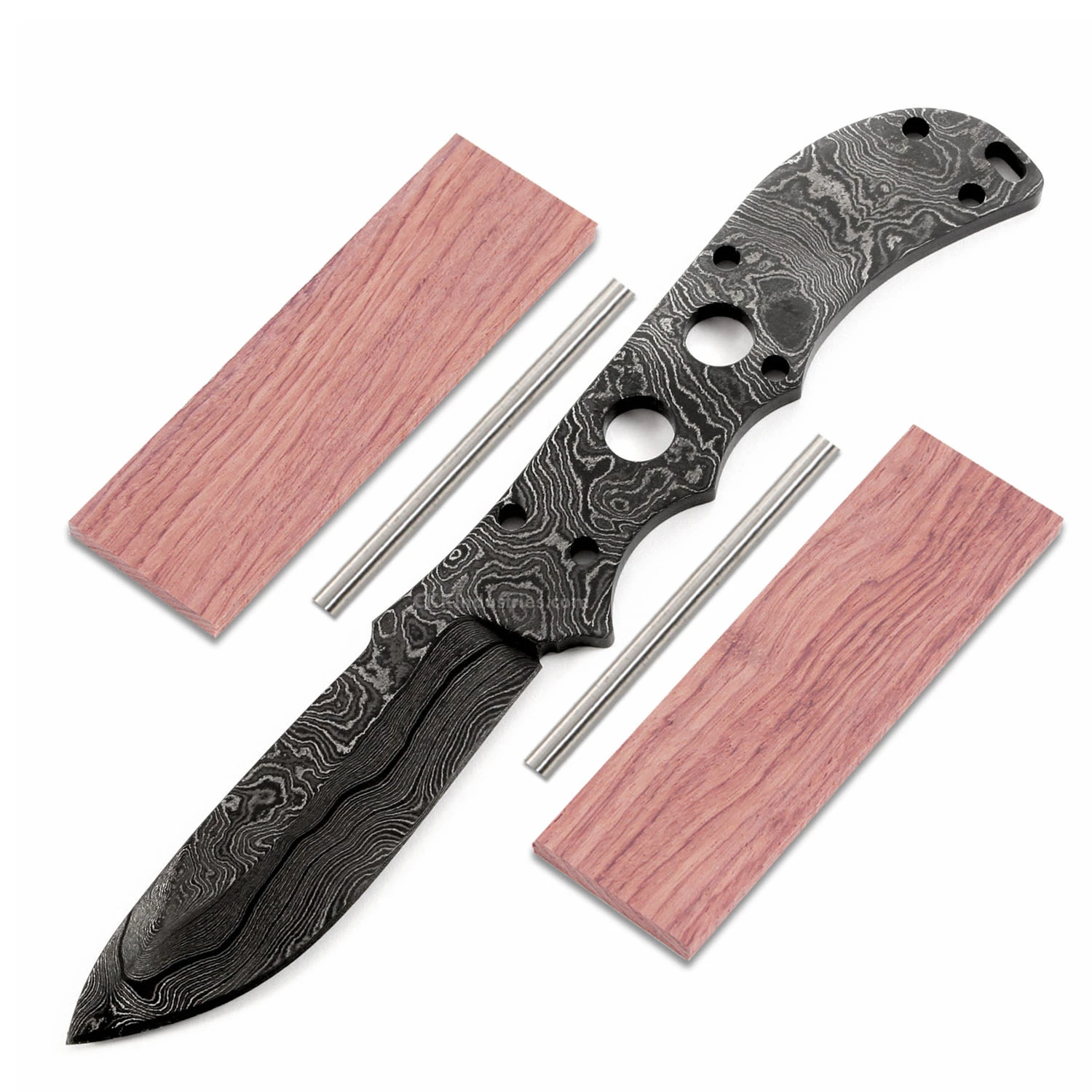This damascus spear point knife kit design is called the “Mamba”. It is a USA Made carbon steel damascus fixed blade knife blank that is hollow-ground and ready to build. This drop point blade blank model is is a perfect size for a sheath carry knife. The Mamba damascus drop point blade blank has a blade length of 3.50 inches and an overall length of 8.375 inches. Ground on both sides, the blade is 1.05 inches wide. This damascus blade blank design features (6) .156 inch through-holes for handle construction (stainless steel pinstock included). This version of the Mamba is the combo kit. It comes with the Mamba blade plus Bubinga handle scales, and stainless steel pinstock to simplify the completion process. The tang holes can be modified with ease to work with larger pinstock, or with threaded fasteners. Please see our drills and taps sections for more options.