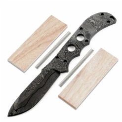 This damascus spear point knife kit design is called the “Mamba”. It is a USA Made carbon steel damascus fixed blade knife blank that is hollow-ground and ready to build. This drop point blade blank model is is a perfect size for a sheath carry knife. The Mamba damascus drop point blade blank has a blade length of 3.50 inches and an overall length of 8.375 inches. Ground on both sides, the blade is 1.05 inches wide. This damascus blade blank design features (6) .156 inch through-holes for handle construction (stainless steel pinstock included). This version of the Mamba is the combo kit. It comes with the Mamba blade plus Canarywood handle scales, and stainless steel pinstock to simplify the completion process. The tang holes can be modified with ease to work with larger pinstock, or with threaded fasteners. Please see our drills and taps sections for more options.