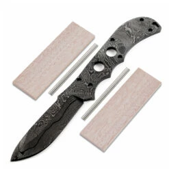 This damascus spear point knife kit design is called the “Mamba”. It is a USA Made carbon steel damascus fixed blade knife blank that is hollow-ground and ready to build. This drop point blade blank model is is a perfect size for a sheath carry knife. The Mamba damascus drop point blade blank has a blade length of 3.50 inches and an overall length of 8.375 inches. Ground on both sides, the blade is 1.05 inches wide. This damascus blade blank design features (6) .156 inch through-holes for handle construction (stainless steel pinstock included). This version of the Mamba is the combo kit. It comes with the Mamba blade plus Mahogany handle scales, and stainless steel pinstock to simplify the completion process. The tang holes can be modified with ease to work with larger pinstock, or with threaded fasteners. Please see our drills and taps sections for more options.