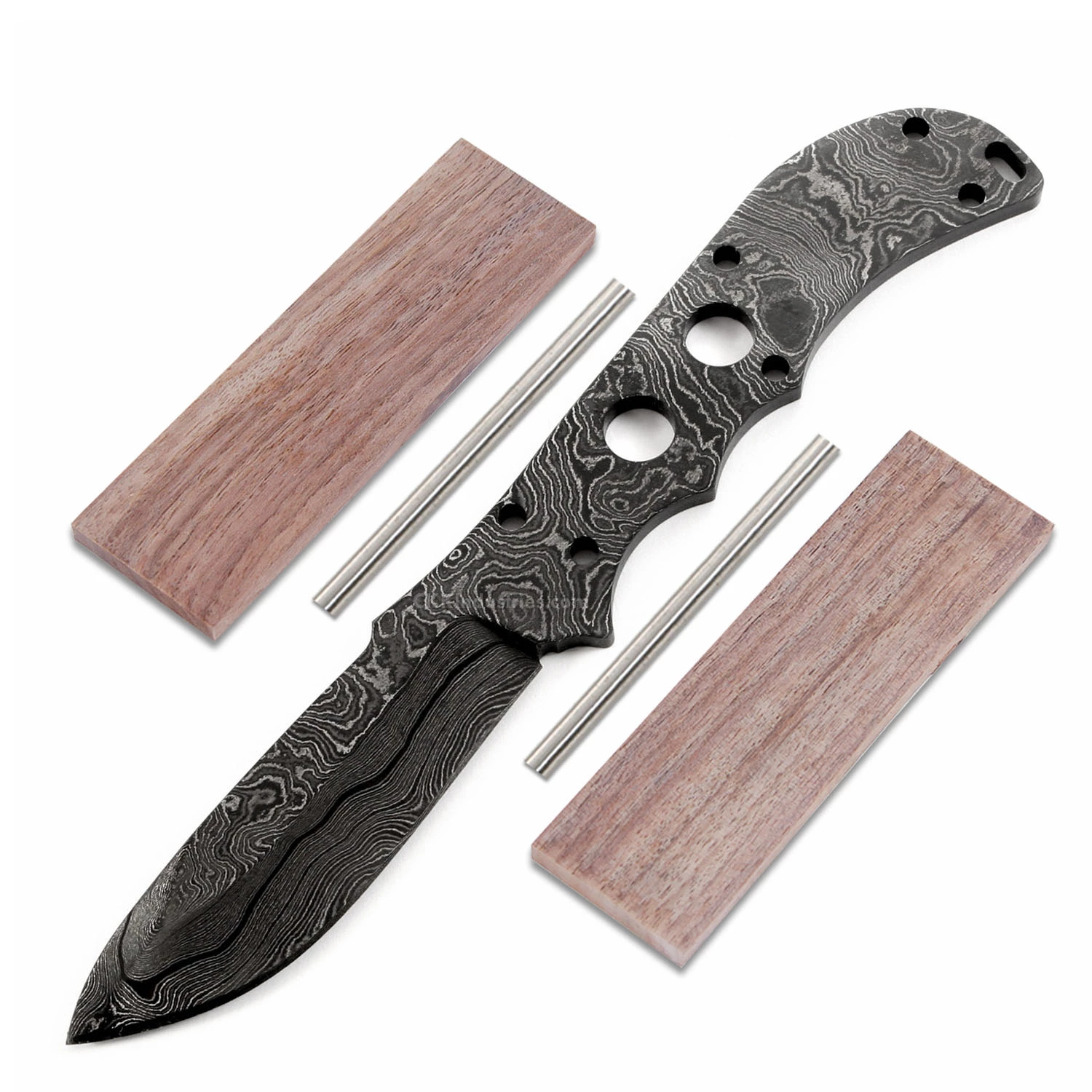 This damascus spear point knife kit design is called the “Mamba”. It is a USA Made carbon steel damascus fixed blade knife blank that is hollow-ground and ready to build. This drop point blade blank model is is a perfect size for a sheath carry knife. The Mamba damascus drop point blade blank has a blade length of 3.50 inches and an overall length of 8.375 inches. Ground on both sides, the blade is 1.05 inches wide. This damascus blade blank design features (6) .156 inch through-holes for handle construction (stainless steel pinstock included). This version of the Mamba is the combo kit. It comes with the Mamba blade plus Walnut handle scales, and stainless steel pinstock to simplify the completion process. The tang holes can be modified with ease to work with larger pinstock, or with threaded fasteners. Please see our drills and taps sections for more options.