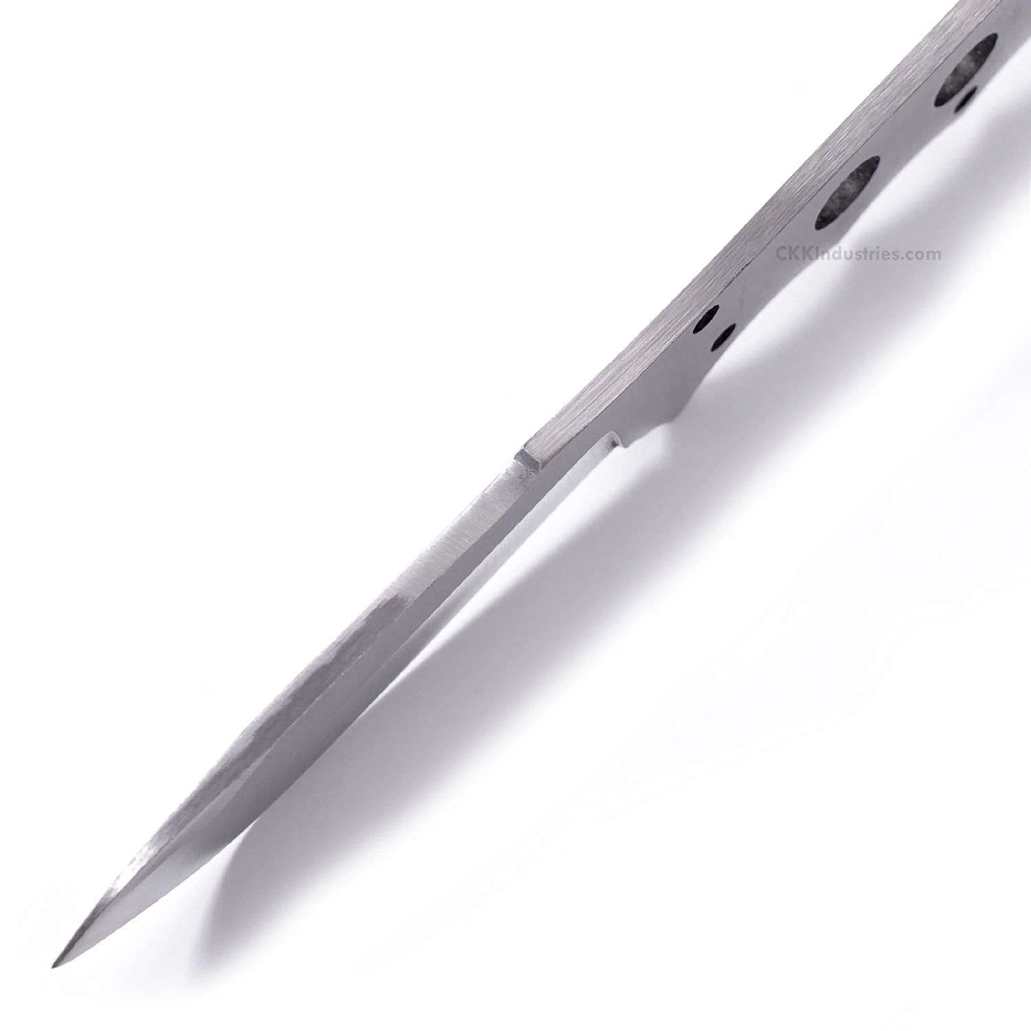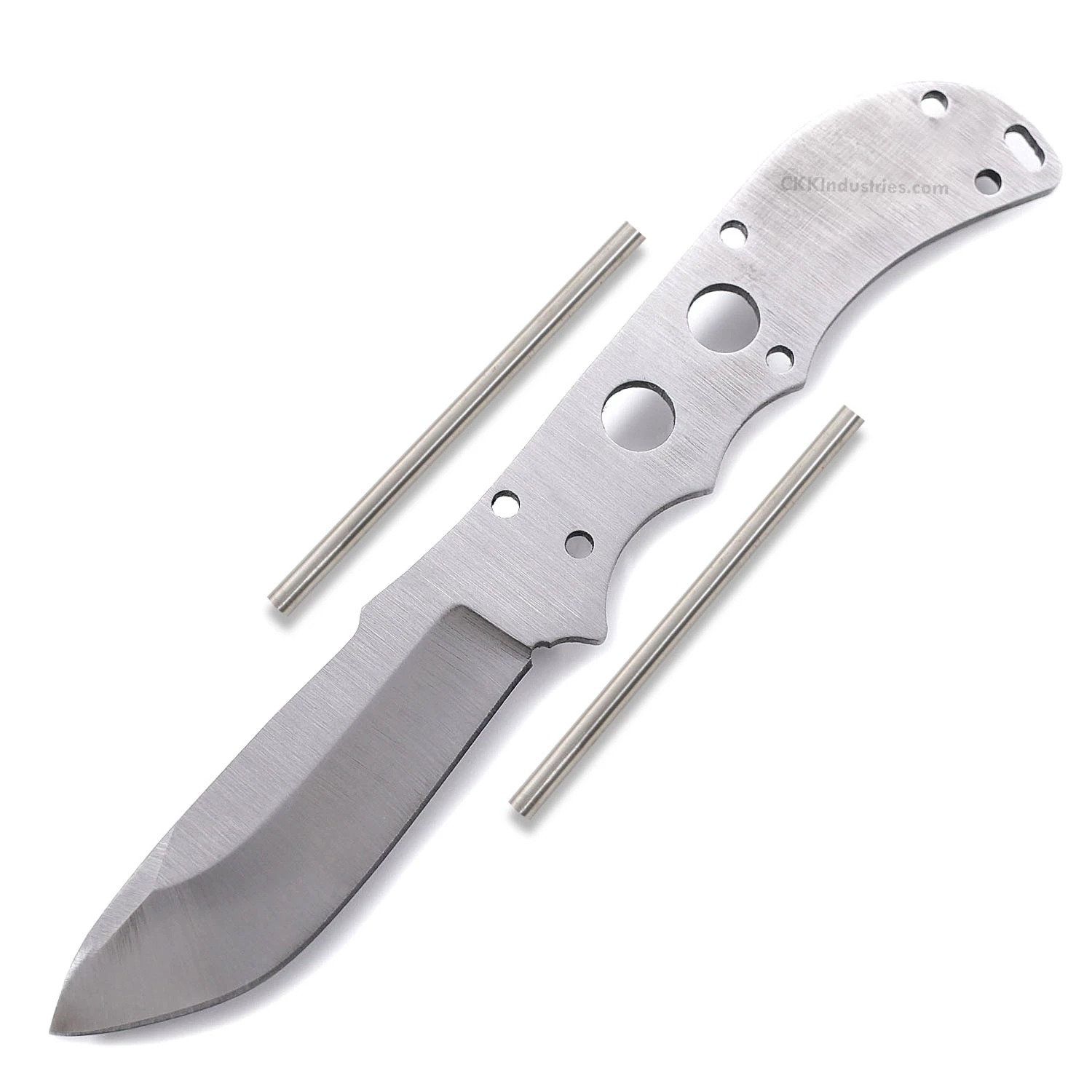 This high carbon spear point knife kit design is called the “Mamba”. It is a USA Made 1075 high carbon steel fixed blade knife blank that is hollow-ground and ready to build. This drop point blade blank model is is a perfect size for a sheath carry knife. The Mamba high carbon drop point blade blank has a blade length of 3-1/2 inches and an overall length of 8.375 inches. Ground on both sides, the blade is 1.05 inches wide. This high carbon blade blank design features (6) .156 inch through-holes for handle construction (stainless steel pinstock included). The tang holes can be modified with ease to work with larger pinstock, or with threaded fasteners. Please see our knife making parts section for more options.