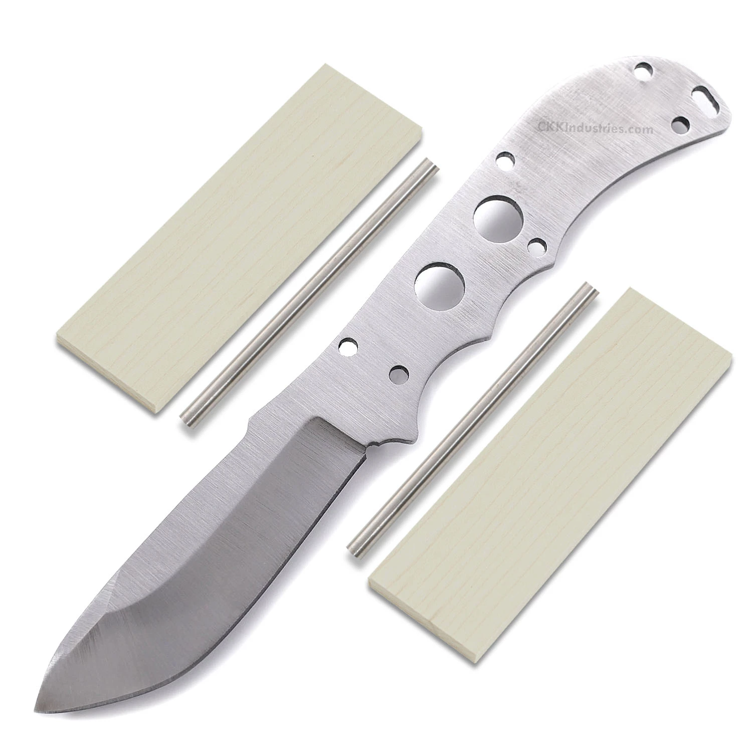 This high carbon drop point knife kit design is called the “Mamba”. It is a USA Made 1075 high carbon steel fixed blade knife blank that is hollow-ground and ready to build. This drop point blade blank model is is a perfect size for a sheath carry knife. The Mamba high carbon drop point blade blank has a blade length of 3-1/2 inches and an overall length of 8.375 inches. Ground on both sides, the blade is 1.05 inches wide. This high carbon blade blank design features (6) .156 inch through-holes for handle construction (stainless steel pinstock included). The tang holes can be modified with ease to work with larger pinstock, or with threaded fasteners. Please see our knife making parts section for more options. This version of the Mamba is the combo kit. It comes with the Mamba blade plus Curly Maple handle scales, and stainless steel pinstock to simplify the completion process. This is a great project blade for a weekend knife making session. Spend some quality workshop time with this knife kit and enjoy the fun of custom knife making and customization.