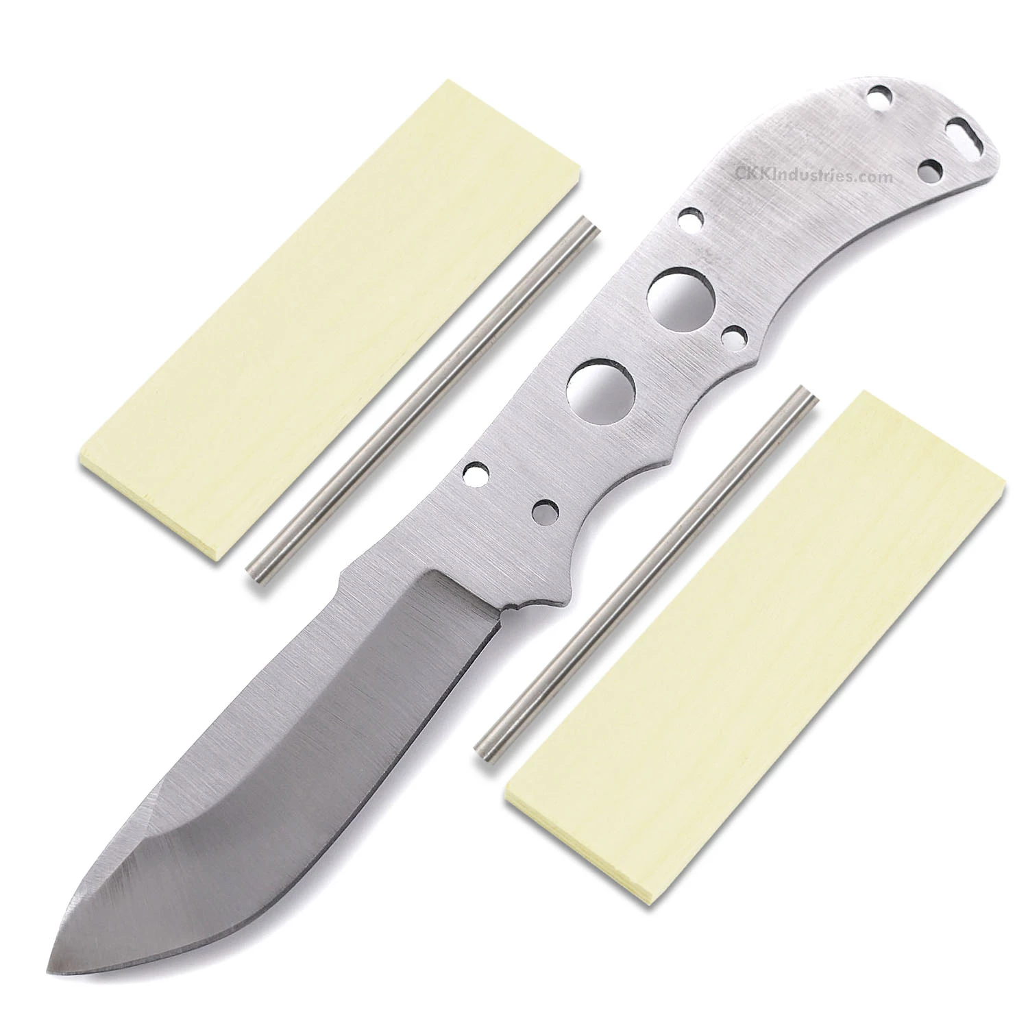 This high carbon drop point knife kit design is called the “Mamba”. It is a USA Made 1075 high carbon steel fixed blade knife blank that is hollow-ground and ready to build. This drop point blade blank model is is a perfect size for a sheath carry knife. The Mamba high carbon drop point blade blank has a blade length of 3-1/2 inches and an overall length of 8.375 inches. Ground on both sides, the blade is 1.05 inches wide. This high carbon blade blank design features (6) .156 inch through-holes for handle construction (stainless steel pinstock included). The tang holes can be modified with ease to work with larger pinstock, or with threaded fasteners. Please see our knife making parts section for more options. This version of the Mamba is the combo kit. It comes with the Mamba blade plus Yellowheart handle scales, and stainless steel pinstock to simplify the completion process. This is a great project blade for a weekend knife making session. Spend some quality workshop time with this knife kit and enjoy the fun of custom knife making and customization.