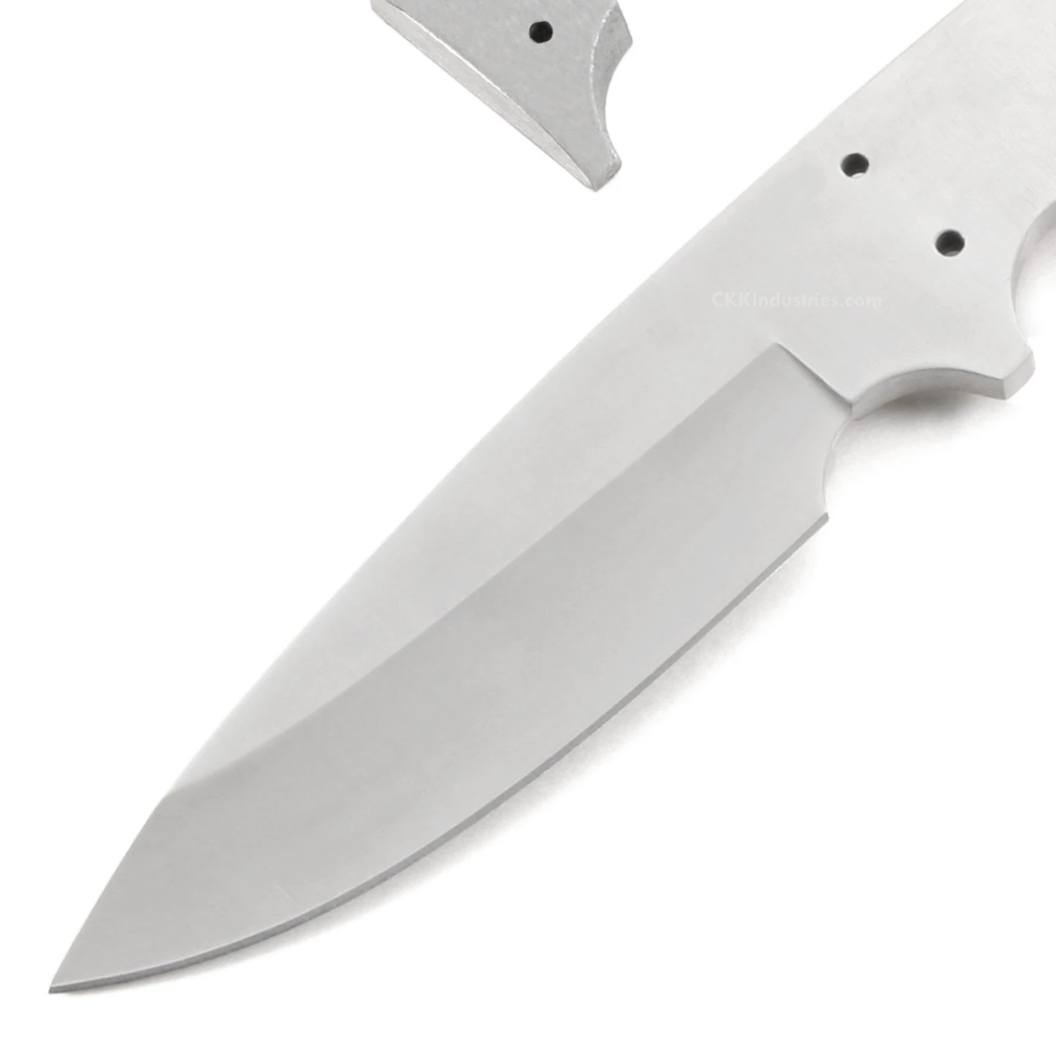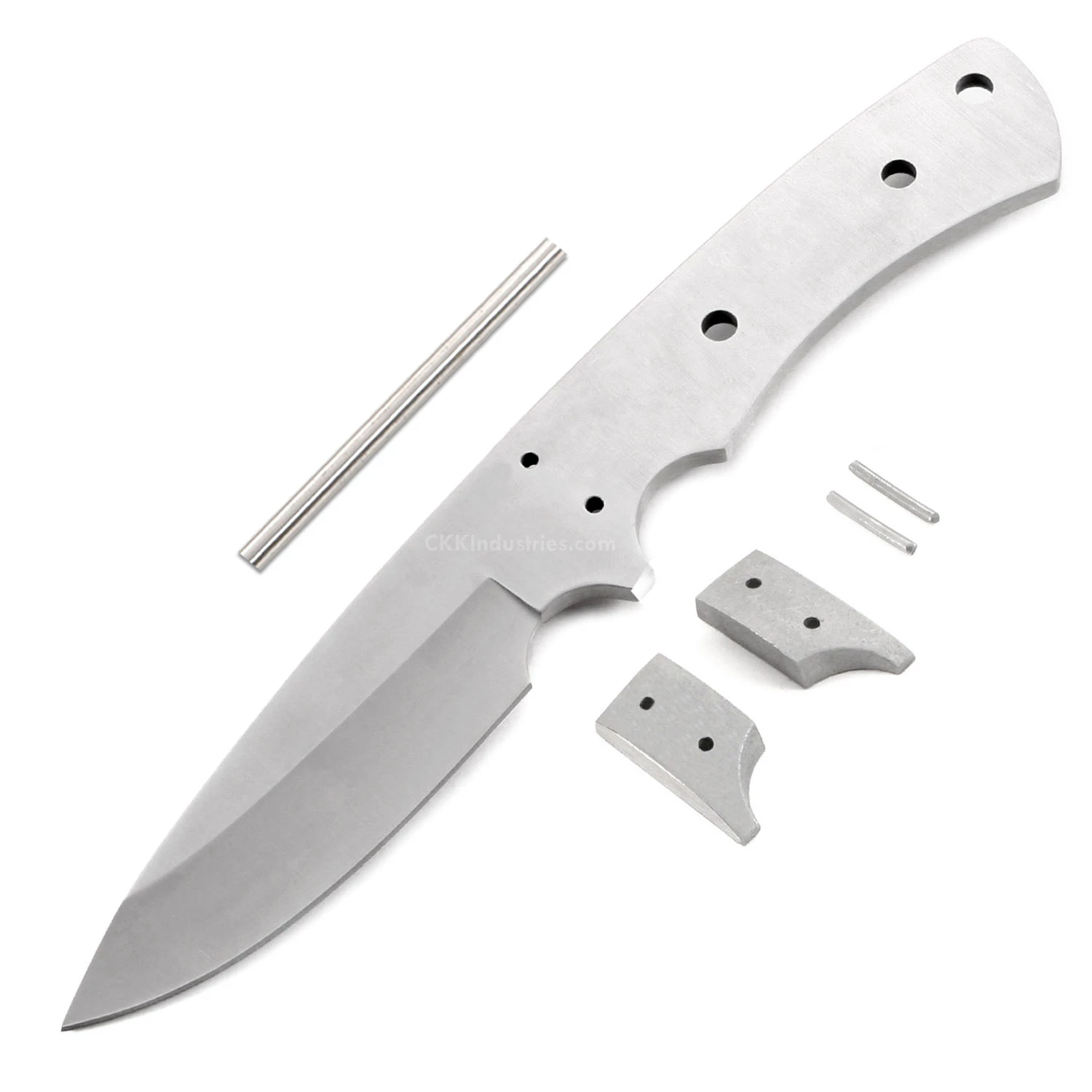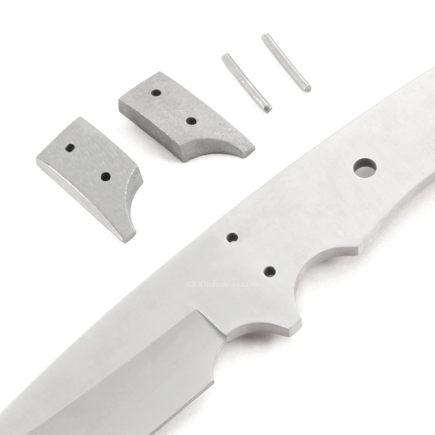 The Maverick Hunter knife making kit is an excellent fixed blade knife kit project. It comes in a satin finish, is hollow-ground and made of 440C stainless steel. It also has finger grooves to increase fine cutting control. This hunting knife design has terrific edge holding properties and comes with stainless bolsters and bolster pins. It also features (2) 0.250 inch tang holes for handle construction (stainless steel pinstock included), and includes a pre-drilled 0.275 inch thong hole for optional lanyard treatment. Properly finished, the Maverick Hunter can compete with custom knives 4-5 times its price. This is a great hunting knife kit design for serious builders.