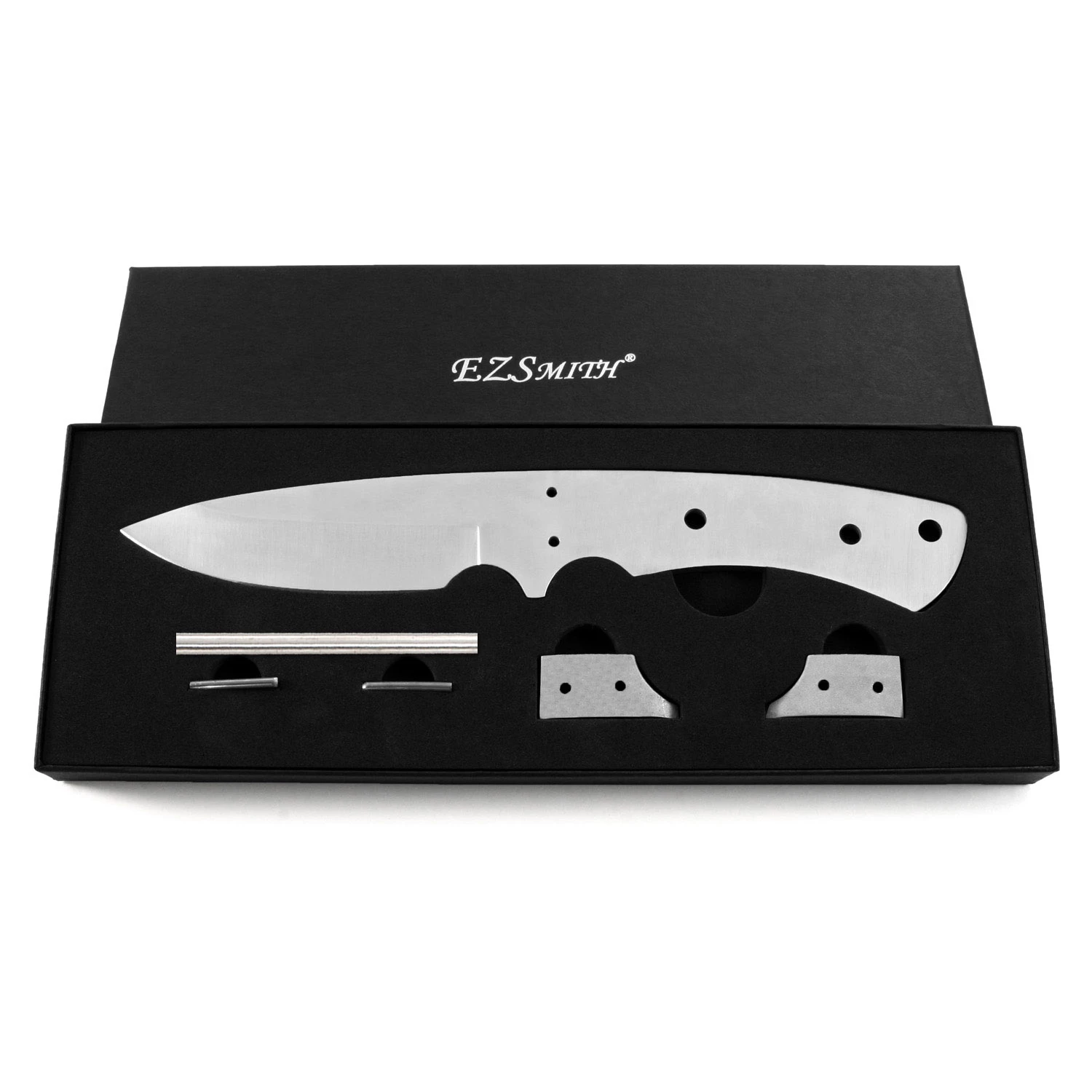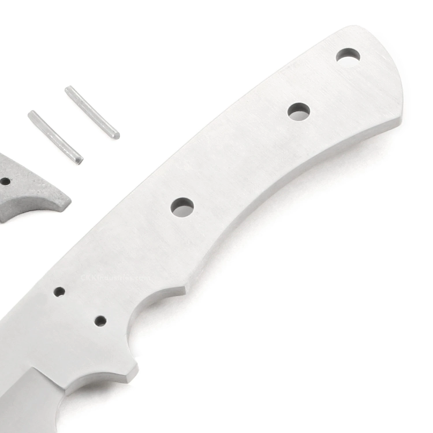 The Maverick Hunter knife making kit is an excellent fixed blade knife kit project. It comes in a satin finish, is hollow-ground and made of 440C stainless steel. It also has finger grooves to increase fine cutting control. This hunting knife design has terrific edge holding properties and comes with stainless bolsters and bolster pins. It also features (2) 0.250 inch tang holes for handle construction (stainless steel pinstock included), and includes a pre-drilled 0.275 inch thong hole for optional lanyard treatment.