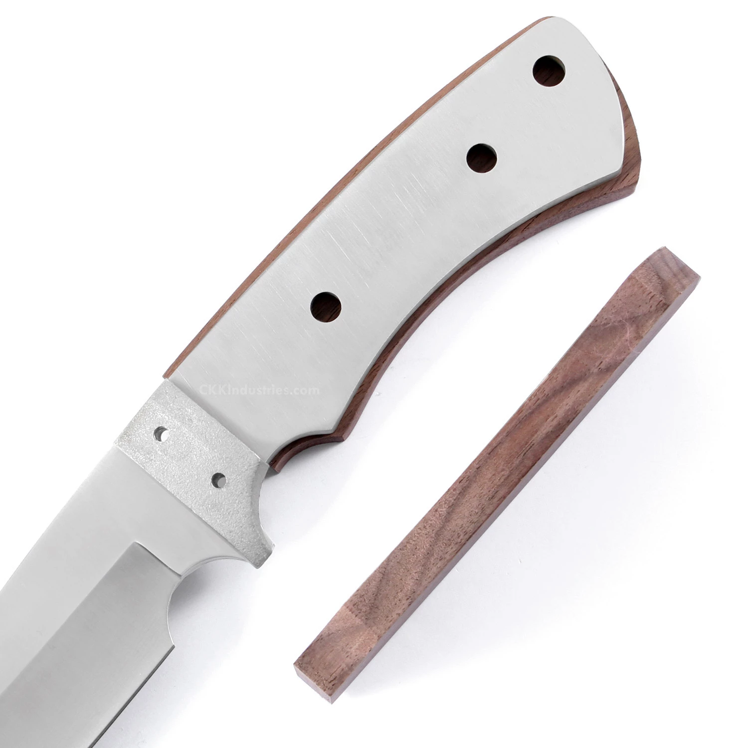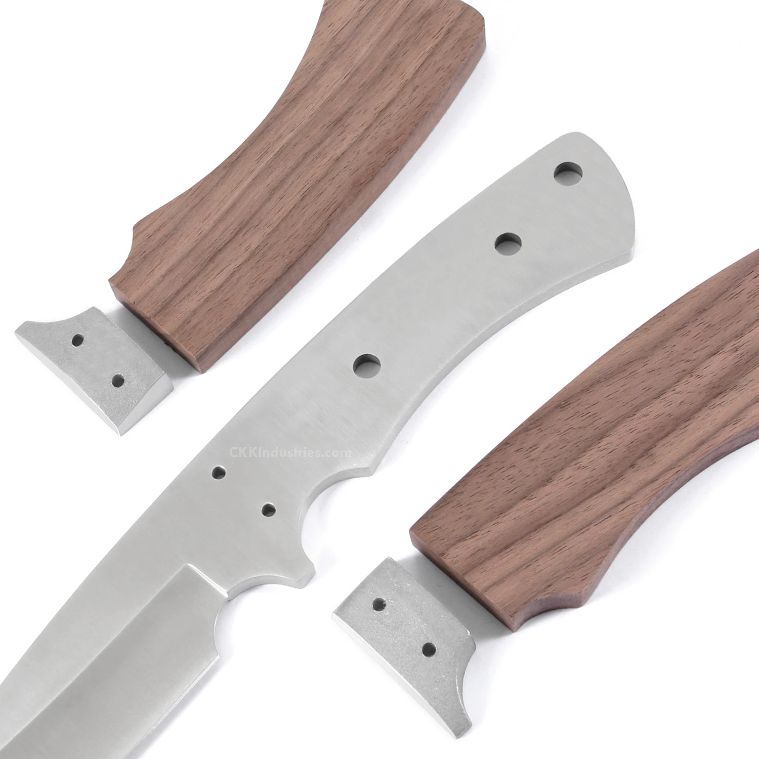 The Maverick Hunter knife making kit is an excellent fixed blade knife kit project. It comes in a satin finish, is hollow-ground and made of 440C stainless steel. It also has finger grooves to increase fine cutting control. This hunting knife blank design has terrific edge holding properties and comes with stainless bolsters and bolster pins. Properly finished, the Maverick Hunter will compete with custom knives 4-5 times its price. This is a great hunting knife making kit design for serious builders. This version is the combo kit. It comes with blade, bolsters, bolster pins and pre-machined Walnut handle material to simplify the completion process. The Maverick Hunter is a great kit knife design for serious builders.
