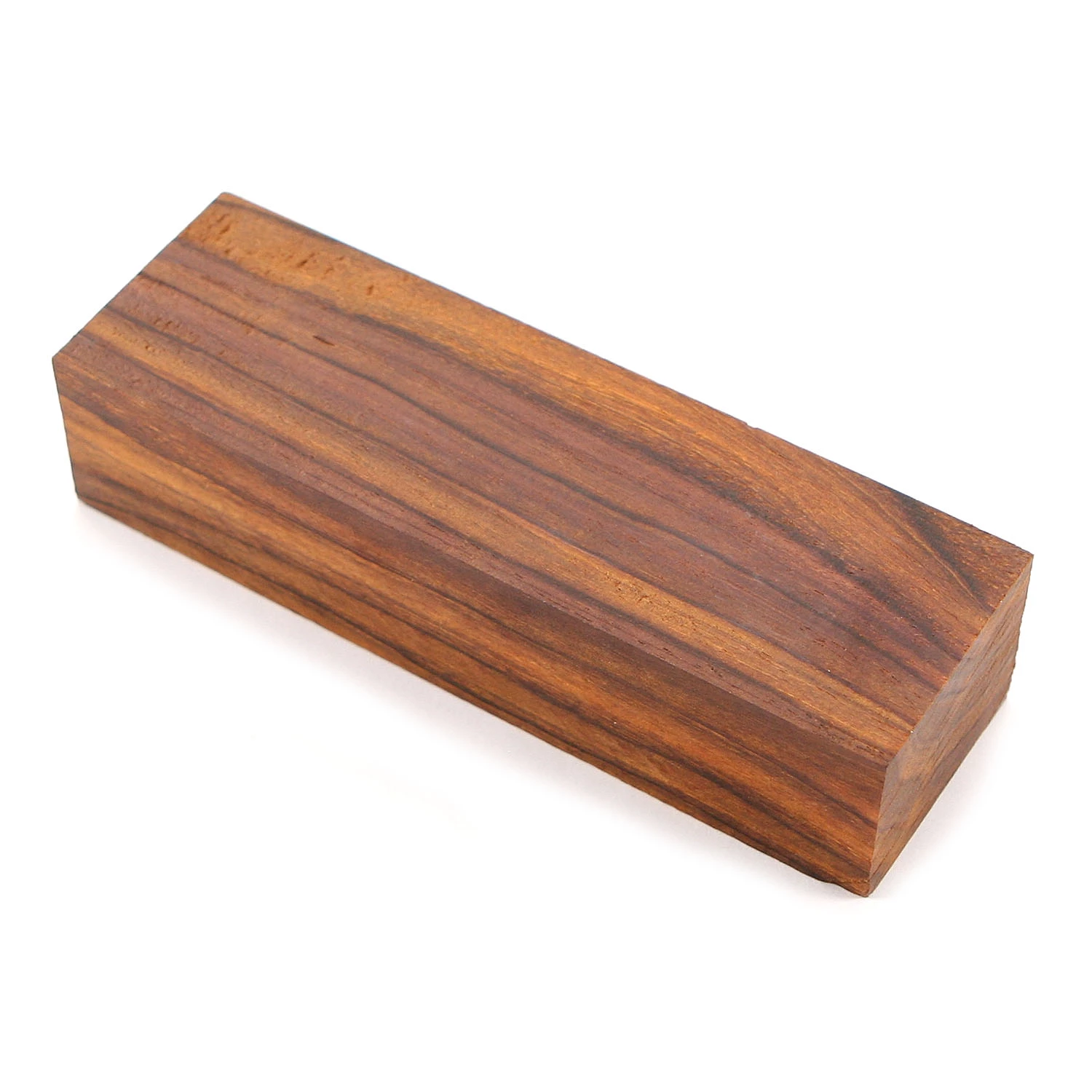 Mexican Cocobolo is a true rosewood and one of the world’s most attractive exotic woods. Its incredible hardness and density, combined with its deeper color tones, including shades of dark orange, deep yellow, burnt red, and rich brown tones, make it a favorite among knife makers around the world. Mexican Cocobolo wood stands up extremely well to repeated handling and exposure to moisture. These traits, plus its natural hardness, make it an excellent choice for use in gun grips and knife handles. Mexican Cocobolo wood knife handle blocks machine very well and can be polished to a lustrous, glass-like finish. The block format allows you to maximize the use, and value of the material, as it can be used as a full piece (for hidden tang designs) and will produce multiple book matched handle scale sets.