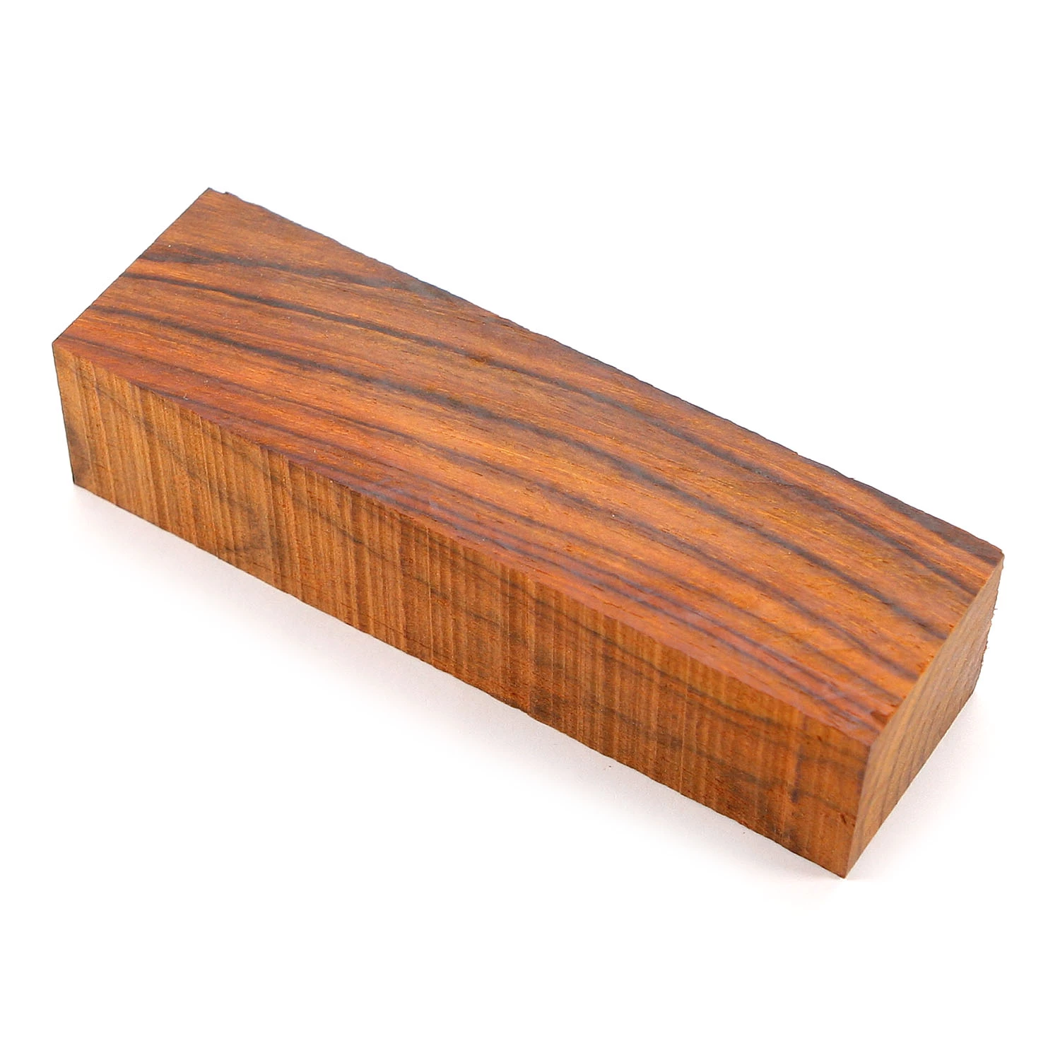 Mexican Cocobolo is a true rosewood and one of the world’s most attractive exotic woods. Its incredible hardness and density, combined with its deeper color tones, including shades of dark orange, deep yellow, burnt red, and rich brown tones, make it a favorite among knife makers around the world. Mexican Cocobolo wood stands up extremely well to repeated handling and exposure to moisture. These traits, plus its natural hardness, make it an excellent choice for use in gun grips and knife handles. Mexican Cocobolo wood knife handle blocks machine very well and can be polished to a lustrous, glass-like finish. The block format allows you to maximize the use, and value of the material, as it can be used as a full piece (for hidden tang designs) and will produce multiple book matched handle scale sets.