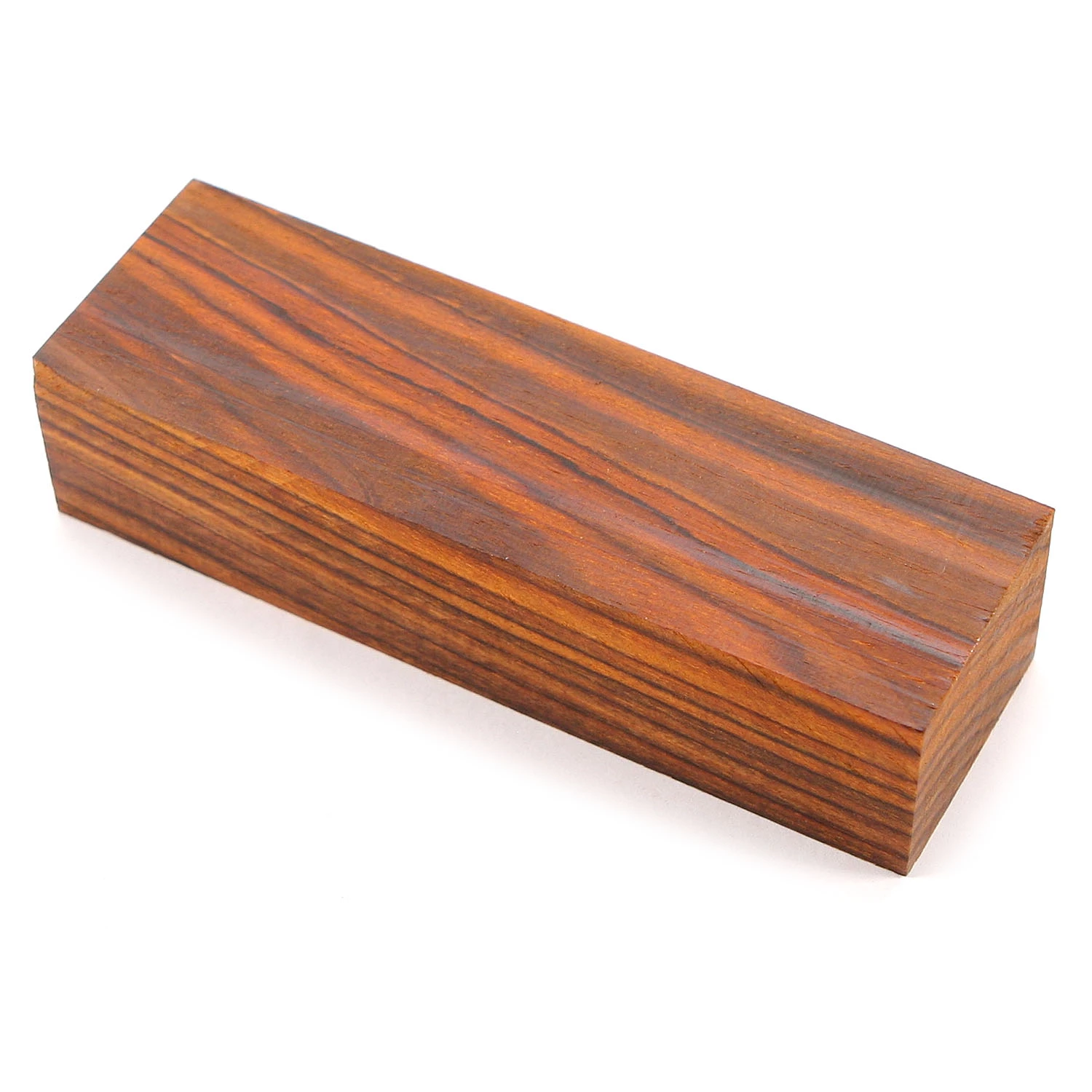 Mexican Cocobolo is a true rosewood and one of the world’s most attractive exotic woods. Its incredible hardness and density, combined with its deeper color tones, including shades of dark orange, deep yellow, burnt red, and rich brown tones, make it a favorite among knife makers around the world. Mexican Cocobolo wood stands up extremely well to repeated handling and exposure to moisture. These traits, plus its natural hardness, make it an excellent choice for use in gun grips and knife handles. Mexican Cocobolo wood knife handle blocks machine very well and can be polished to a lustrous, glass-like finish. The block format allows you to maximize the use, and value of the material, as it can be used as a full piece (for hidden tang designs) and will produce multiple book matched handle scale sets.