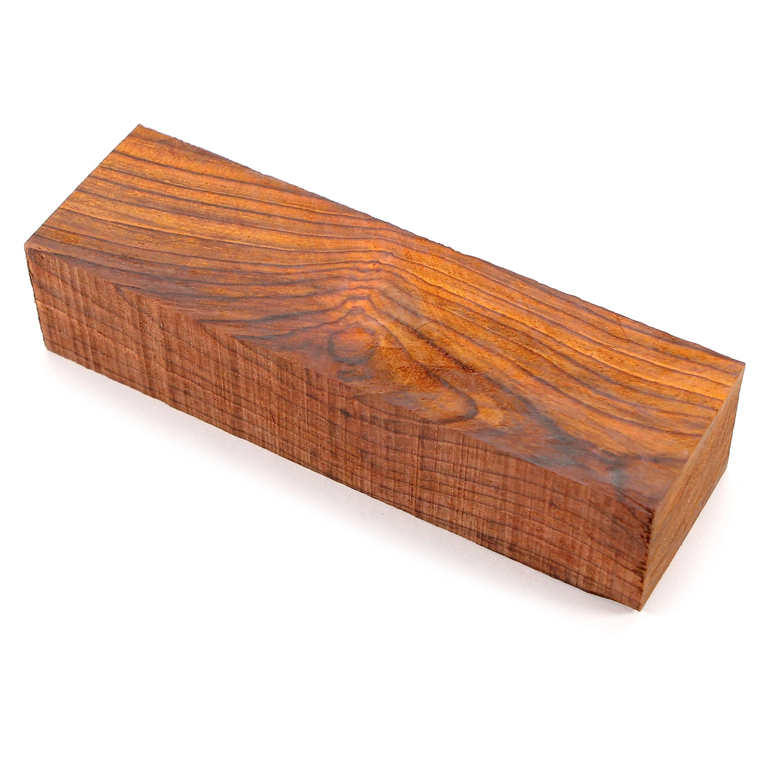 Mexican Cocobolo is a true rosewood and one of the world’s most attractive exotic woods. Its incredible hardness and density, combined with its deeper color tones, including shades of dark orange, deep yellow, burnt red, and rich brown tones, make it a favorite among knife makers around the world. Mexican Cocobolo wood stands up extremely well to repeated handling and exposure to moisture. These traits, plus its natural hardness, make it an excellent choice for use in gun grips and knife handles. Mexican Cocobolo wood knife handle blocks machine very well and can be polished to a lustrous, glass-like finish. The block format allows you to maximize the use, and value of the material, as it can be used as a full piece (for hidden tang designs) and will produce multiple book matched handle scale sets.