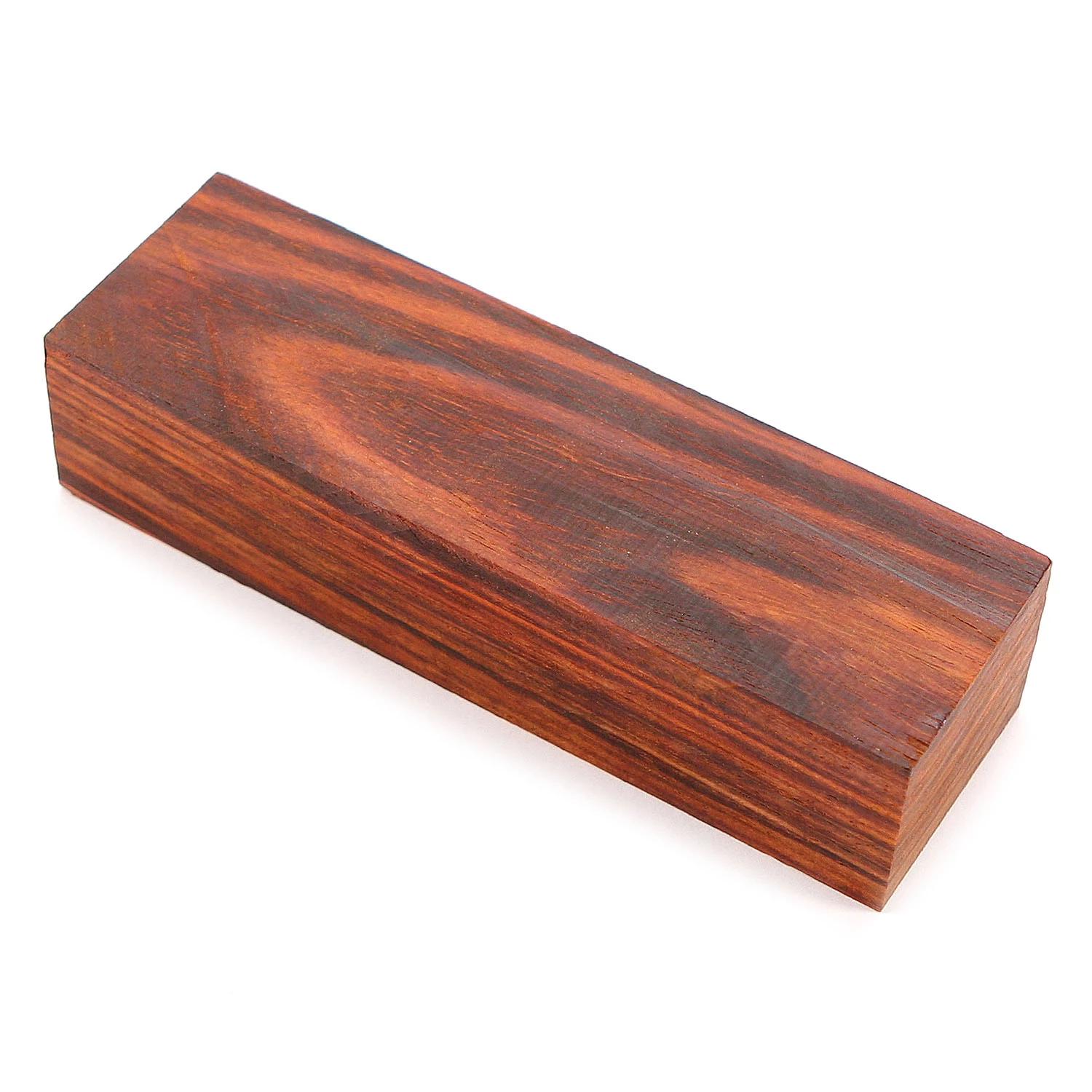 Mexican Cocobolo is a true rosewood and one of the world’s most attractive exotic woods. Its incredible hardness and density, combined with its deeper color tones, including shades of dark orange, deep yellow, burnt red, and rich brown tones, make it a favorite among knife makers around the world. Mexican Cocobolo wood stands up extremely well to repeated handling and exposure to moisture. These traits, plus its natural hardness, make it an excellent choice for use in gun grips and knife handles. Mexican Cocobolo wood knife handle blocks machine very well and can be polished to a lustrous, glass-like finish. The block format allows you to maximize the use, and value of the material, as it can be used as a full piece (for hidden tang designs) and will produce multiple book matched handle scale sets.