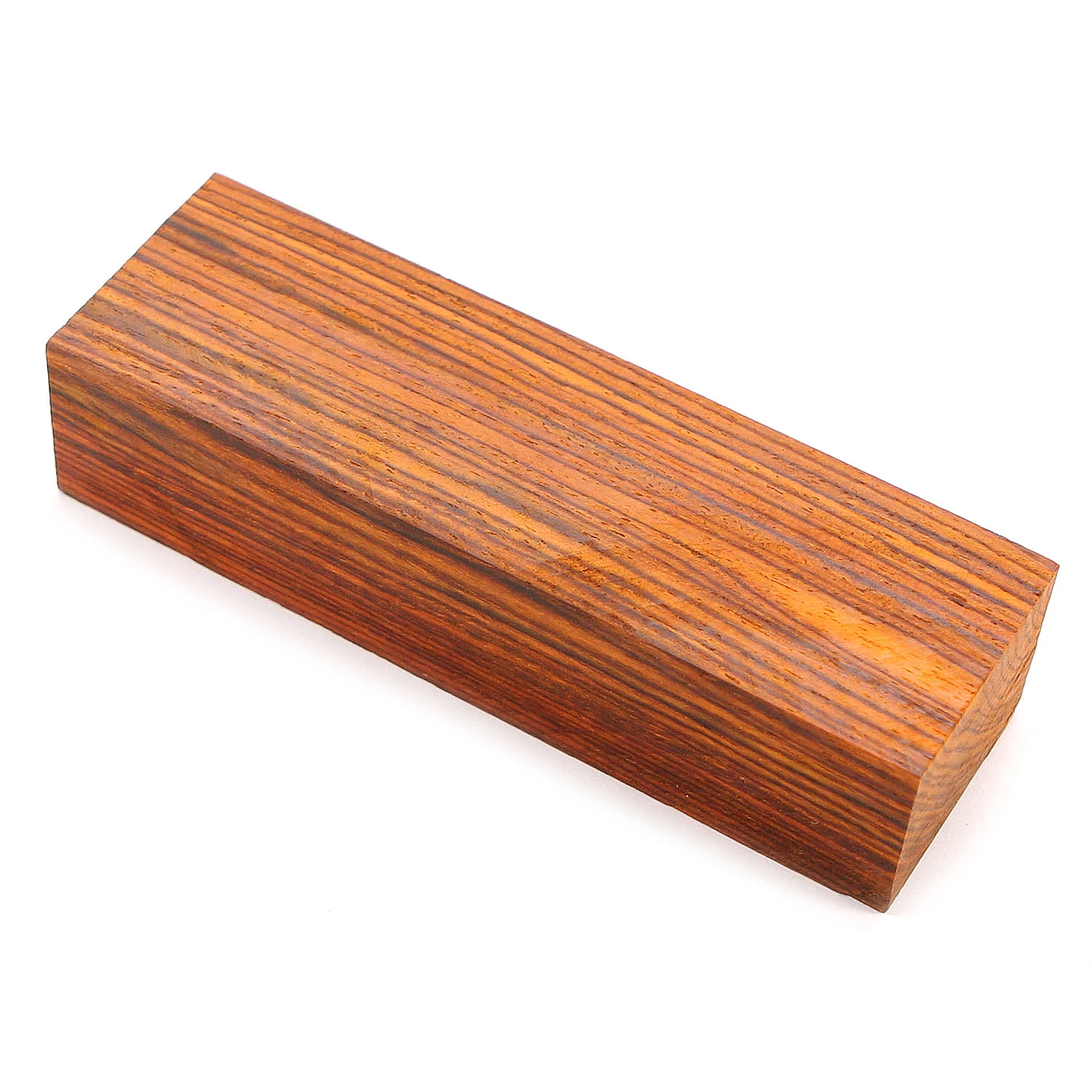 Mexican Cocobolo is a true rosewood and one of the world’s most attractive exotic woods. Its incredible hardness and density, combined with its deeper color tones, including shades of dark orange, deep yellow, burnt red, and rich brown tones, make it a favorite among knife makers around the world. Mexican Cocobolo wood stands up extremely well to repeated handling and exposure to moisture. These traits, plus its natural hardness, make it an excellent choice for use in gun grips and knife handles. Mexican Cocobolo wood knife handle blocks machine very well and can be polished to a lustrous, glass-like finish. The block format allows you to maximize the use, and value of the material, as it can be used as a full piece (for hidden tang designs) and will produce multiple book matched handle scale sets.
