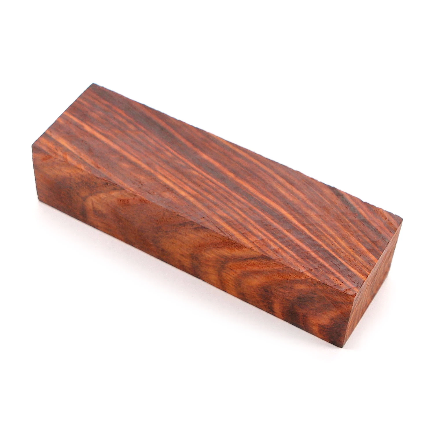 Mexican Cocobolo is a true rosewood and one of the world’s most attractive exotic woods. Its incredible hardness and density, combined with its deeper color tones, including shades of dark orange, deep yellow, burnt red, and rich brown tones, make it a favorite among knife makers around the world. Mexican Cocobolo wood stands up extremely well to repeated handling and exposure to moisture. These traits, plus its natural hardness, make it an excellent choice for use in gun grips and knife handles. Mexican Cocobolo wood knife handle blocks machine very well and can be polished to a lustrous, glass-like finish. The block format allows you to maximize the use, and value of the material, as it can be used as a full piece (for hidden tang designs) and will produce multiple book matched handle scale sets.