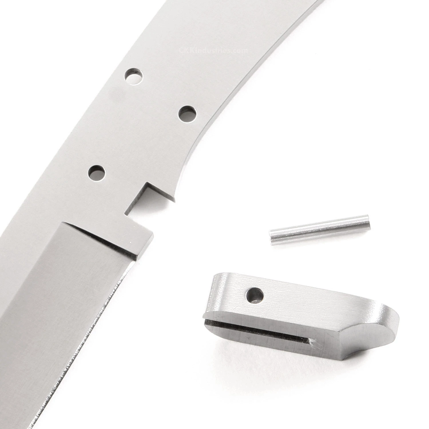 The Midwest Hunter knife kit is purpose built for use in the field. The drop point knife blank design allows for a larger cutting edge which makes the Midwest Hunter knife kit great for cutting, carving, and skinning. This design features (5) 0.156 inch through-holes for handle construction (stainless steel pinstock included) and (1) 0.250 thong hole for optional treatment. The tang holes on this model can be modified to work with larger pinstock, or with threaded fasteners.