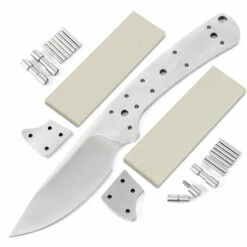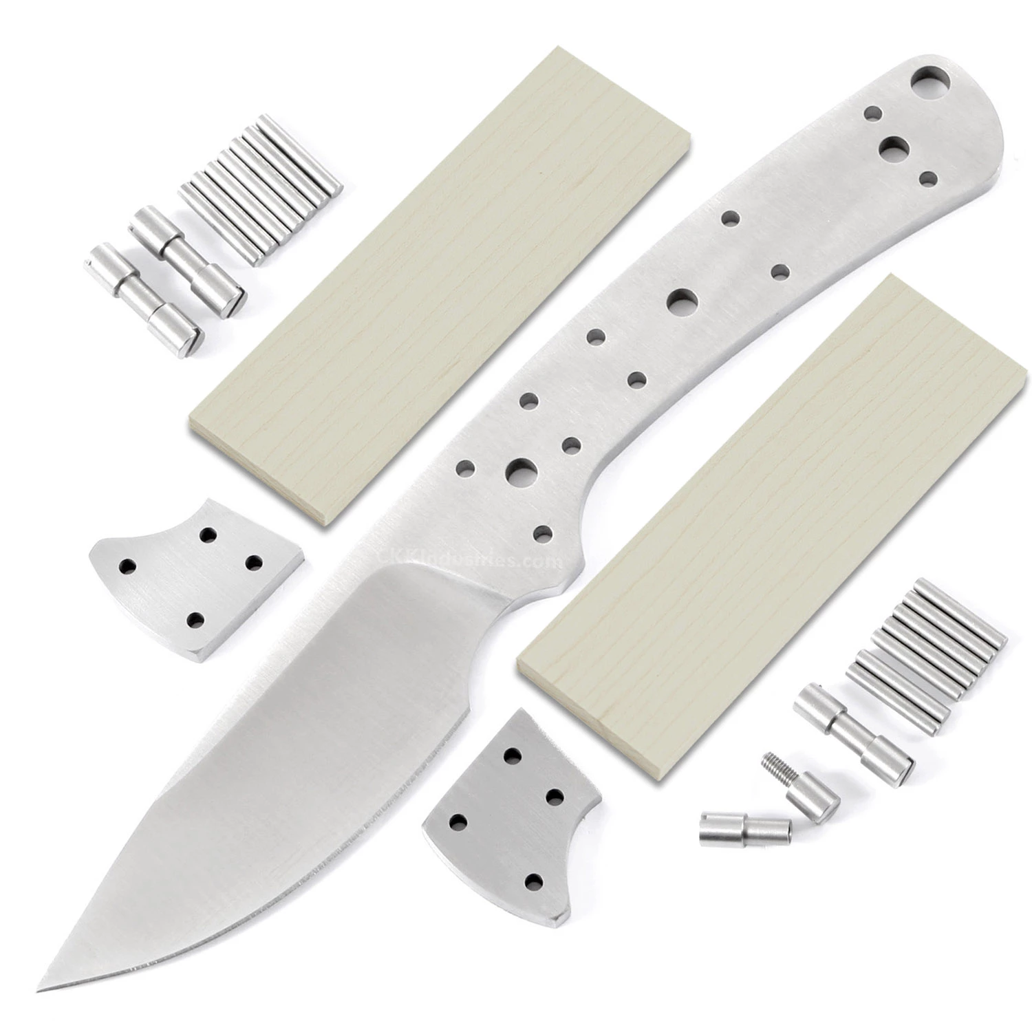 This version is the combo kit. It comes with the Modern Skinner blade blank, bolsters, pins, handle bolt fasteners plus one pair of Curly Maple knife handle scales to simplify the completion process. Add a touch of proper finishing and create a fabulous knife that you’ll be proud to own and carry.