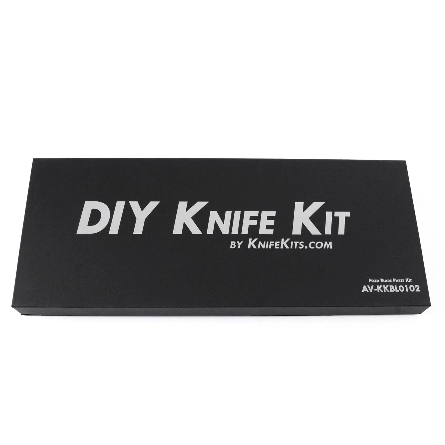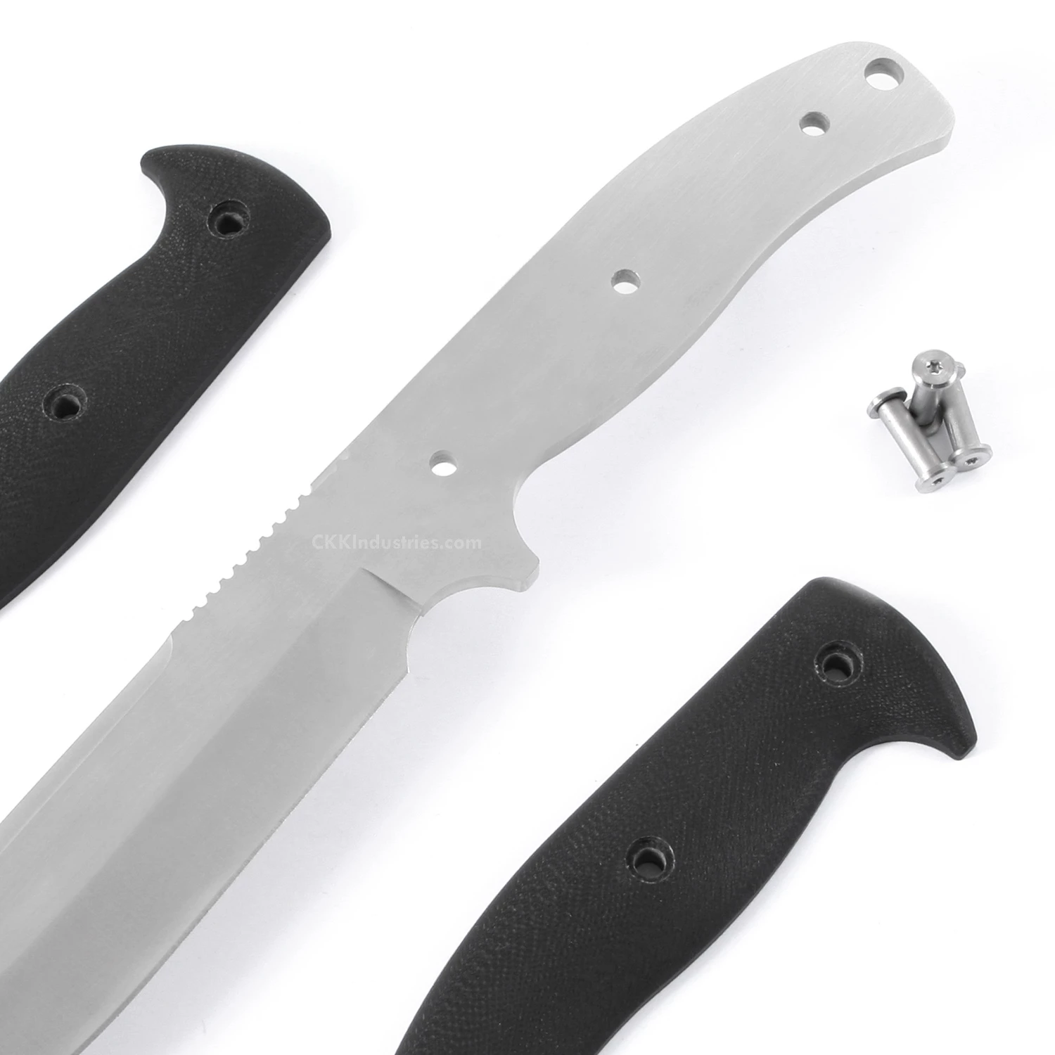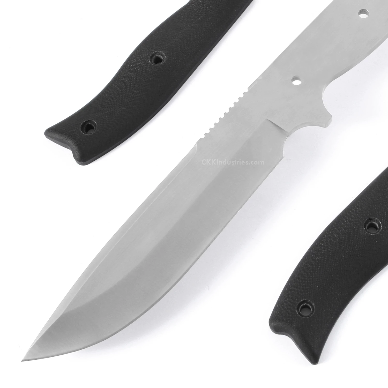This tactical knife making kit features an awesome pre-milled G10 standard handle and fastener treatment. It has an exposed tang with lanyard hole access on the standard build, but you can easily add a full handle treatment with fixed thong and little effort. The standard handles make great handle templates for customizers.