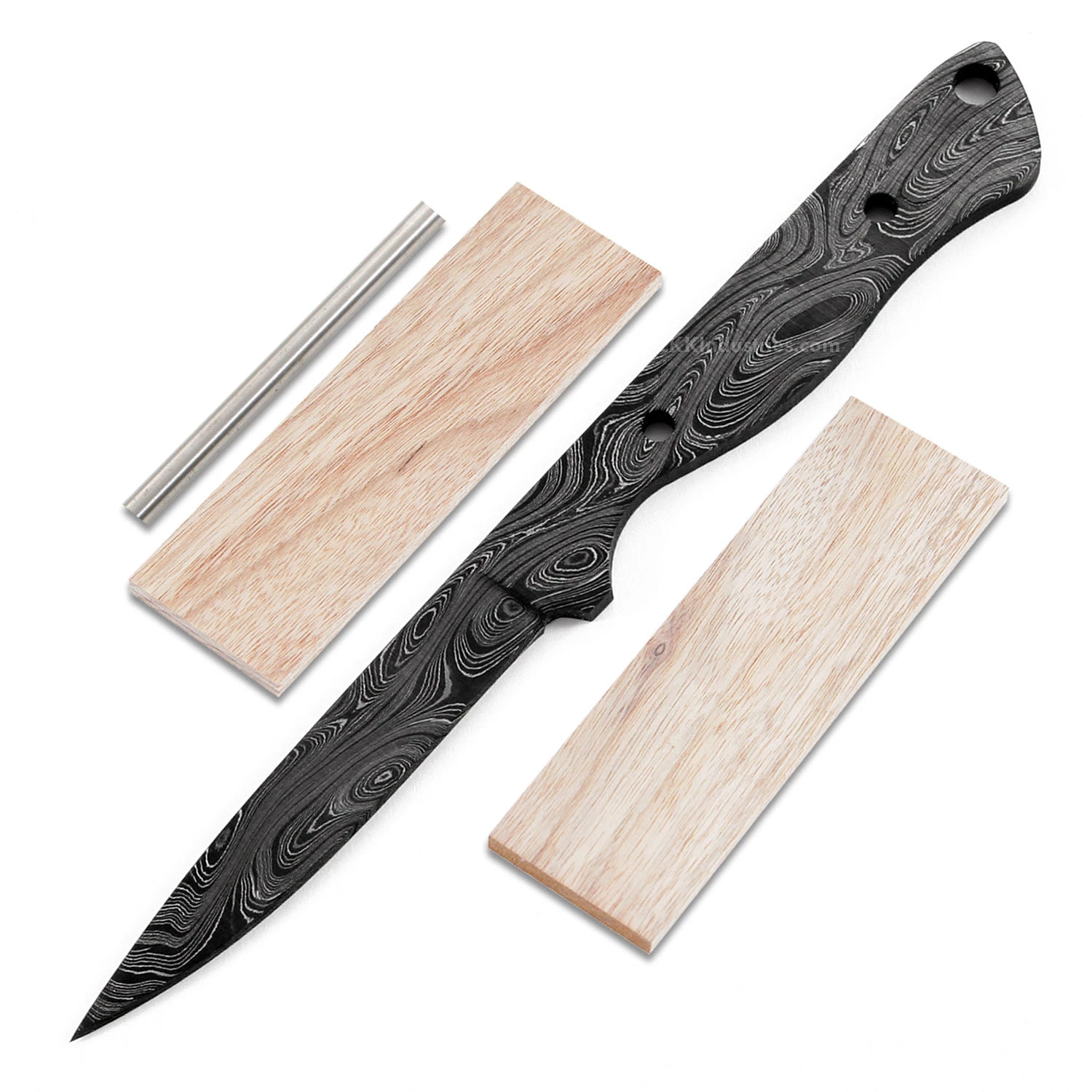 This damascus drop point knife kit design is called the “Osprey”. It is a USA Made carbon steel damascus fixed blade knife blank that is hollow-ground and ready to build. This drop point blade blank model will make a fantastic bird & trout style knife. This would also make a great pick as a collectible gift project. With a blade length of 2.625 inches and an overall length of 6.0 inches, this design is a perfect carry size, and would even work well as a conceal-carry personal knife. Ground on both sides, the Osprey’s blade is 0.50 inches wide with a 0.120 inch thickness. This damascus drop point knife blank design features (2) 0.125 inch through-holes for handle construction (stainless steel pinstock included), and (1) 0.187 thong hole for an optional lanyard. The holes can be easily modified to work with larger pinstock or threaded fasteners.