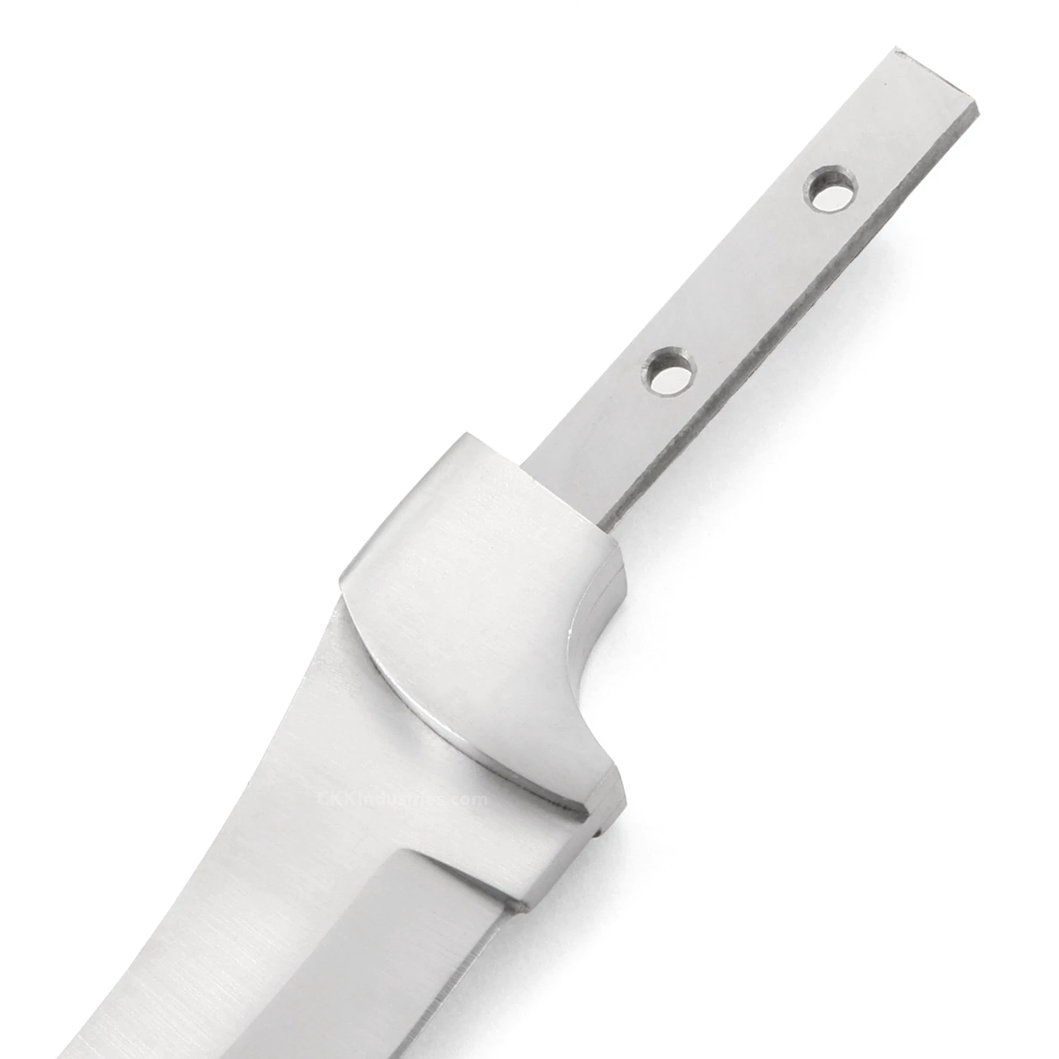 The blade length on the Persian Skinner is 3.75 inches and the thickness is .130 inches. It comes hollow ground, satin finished and has a pre-pinned 416ss finger guard attached. This is a great Persian-styled knife making kit blank, and will make a fun, affordable and simple project to complete. The handle tang on this knife blade blank has (2) pre-drilled .156 (5/32) inch through-holes for handle construction. Stainless steel handle pinstock is incuded with this kit.