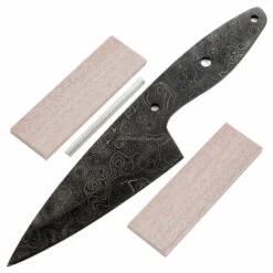 This damascus chef knife making kit is called the Petite Chef. It is a USA Made carbon steel damascus fixed blade knife blank that is flat-ground and ready to build. This chef knife making kit model will make a fantastic working kitchen knife. It is the perfect cutlery addition for the accomplished home chef.