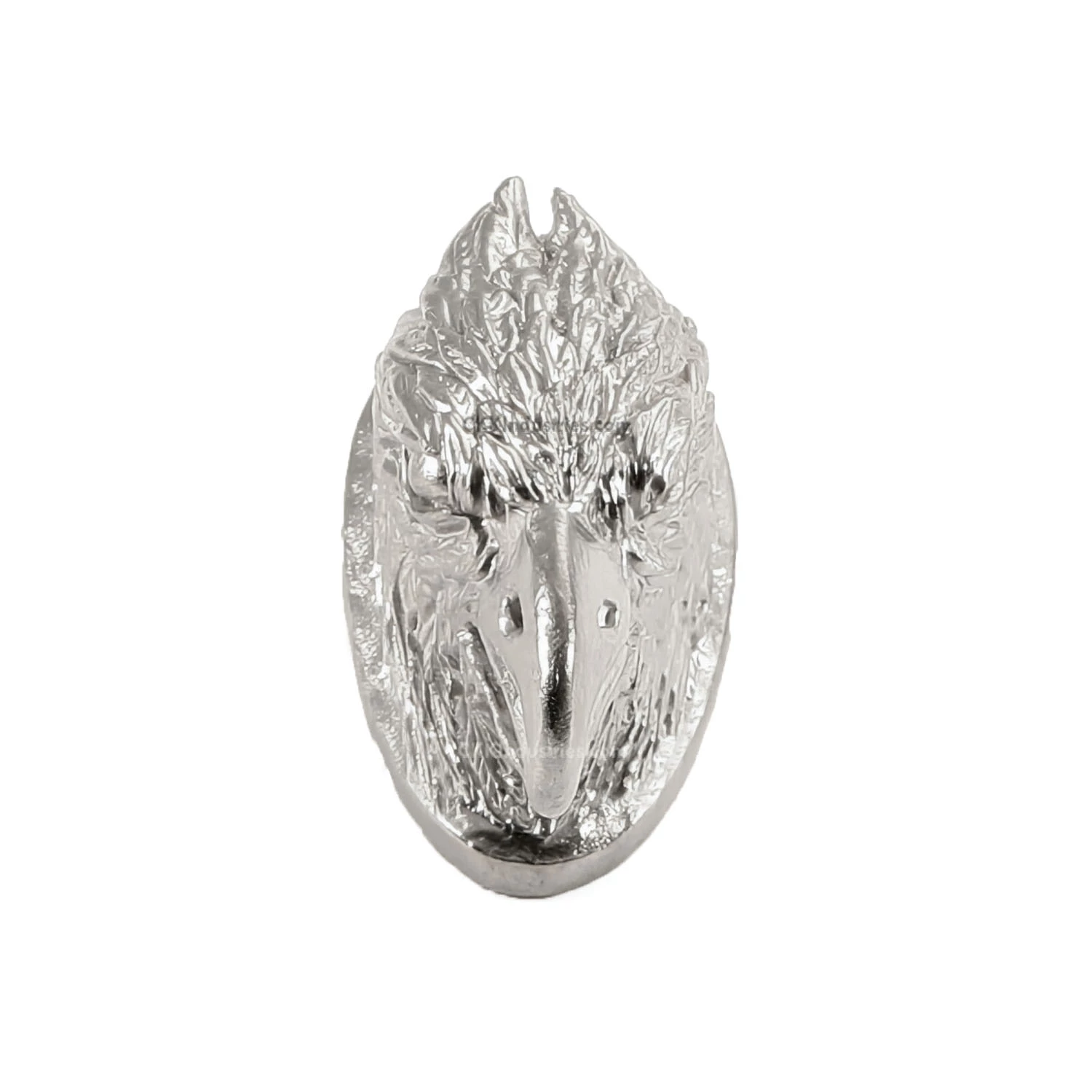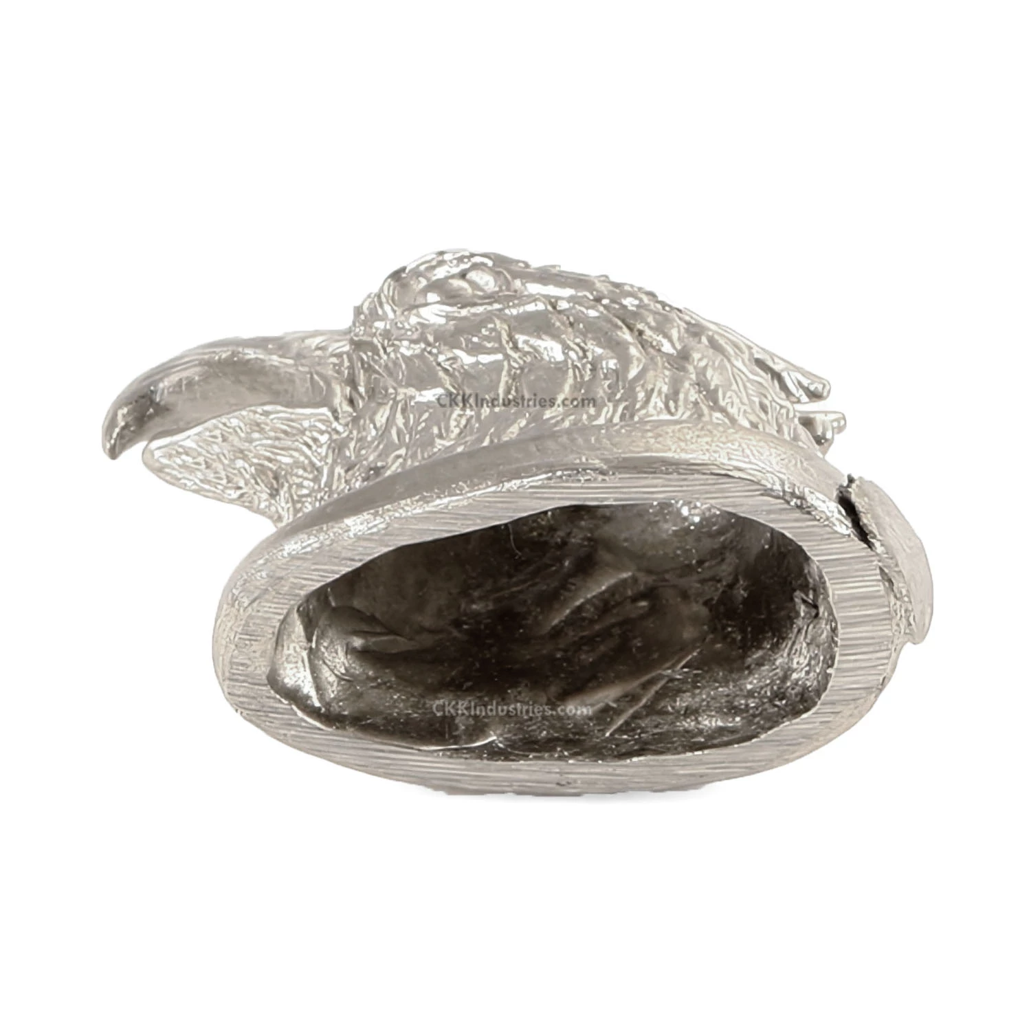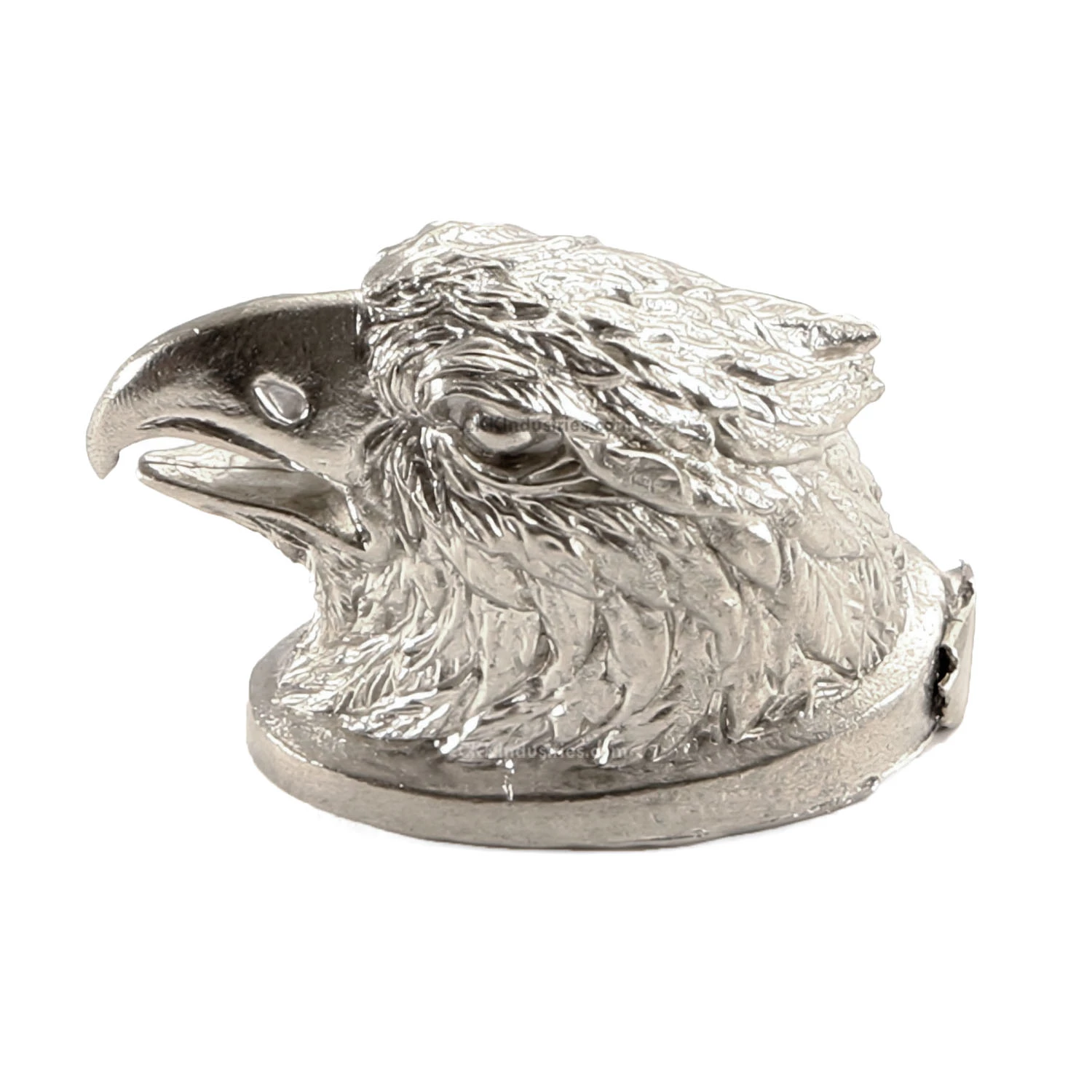 This is a decorative nickel silver pommel used to close (and hold) the handle on a fixed blade knife. This model features a fully engraved eagle’s head. This buttcap can be adapted to work with most hidden tang handle designs. Additional material has been left on bottom and outer edge for finish-sanding and shaping. These are very high quality and will professionally dress-out any custom knife handle.