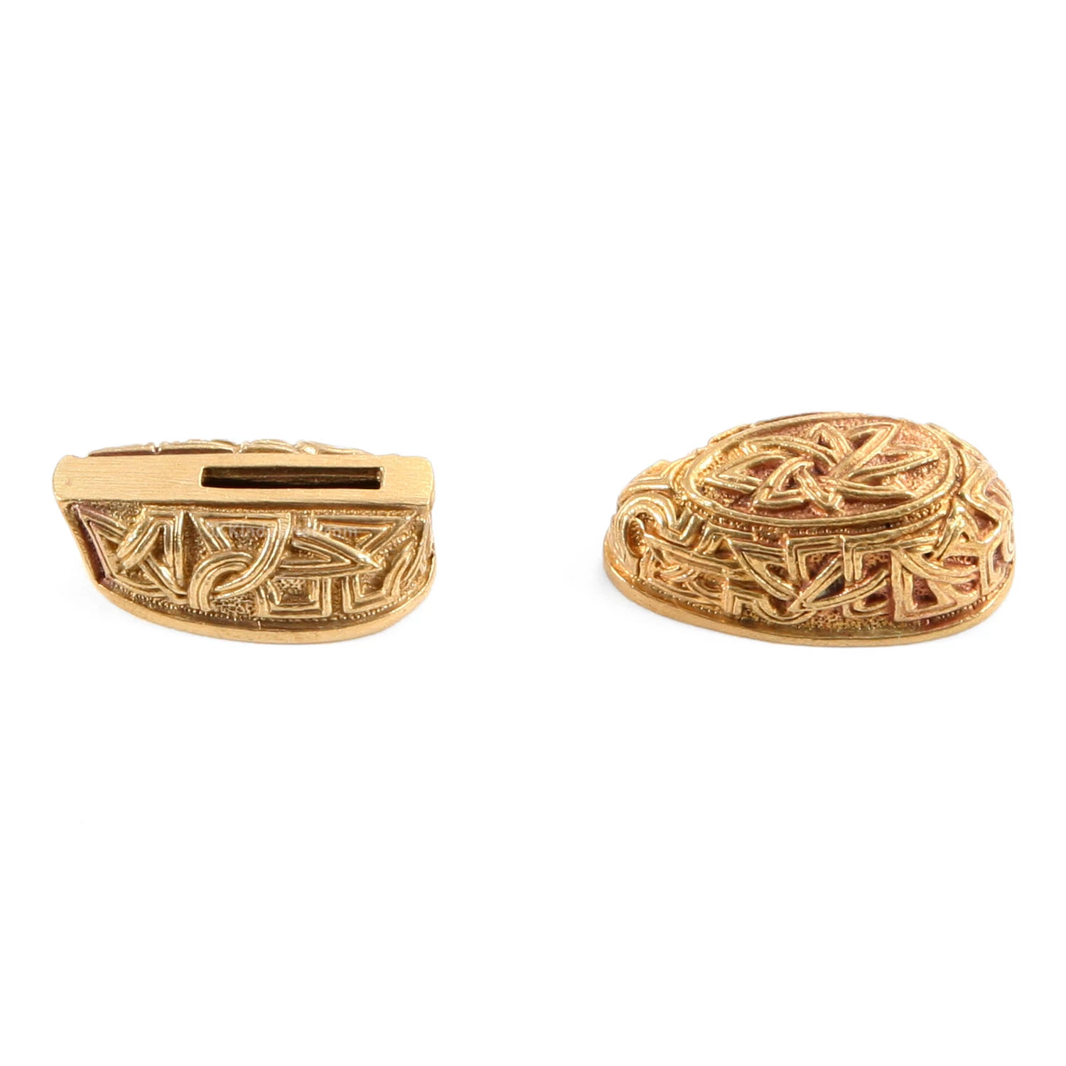 This is an engraved pommel and guard set that can be used to complete a custom hidden tang fixed blade design. These parts are a matched set and include decorative celtic-style knot work. The guard features a (.560″ x .095″) slot, which can be easily enlarged. Both guard and pommel feature deep slipover cavities for versatile fitting. These are a very high-quality, hand cast set!
