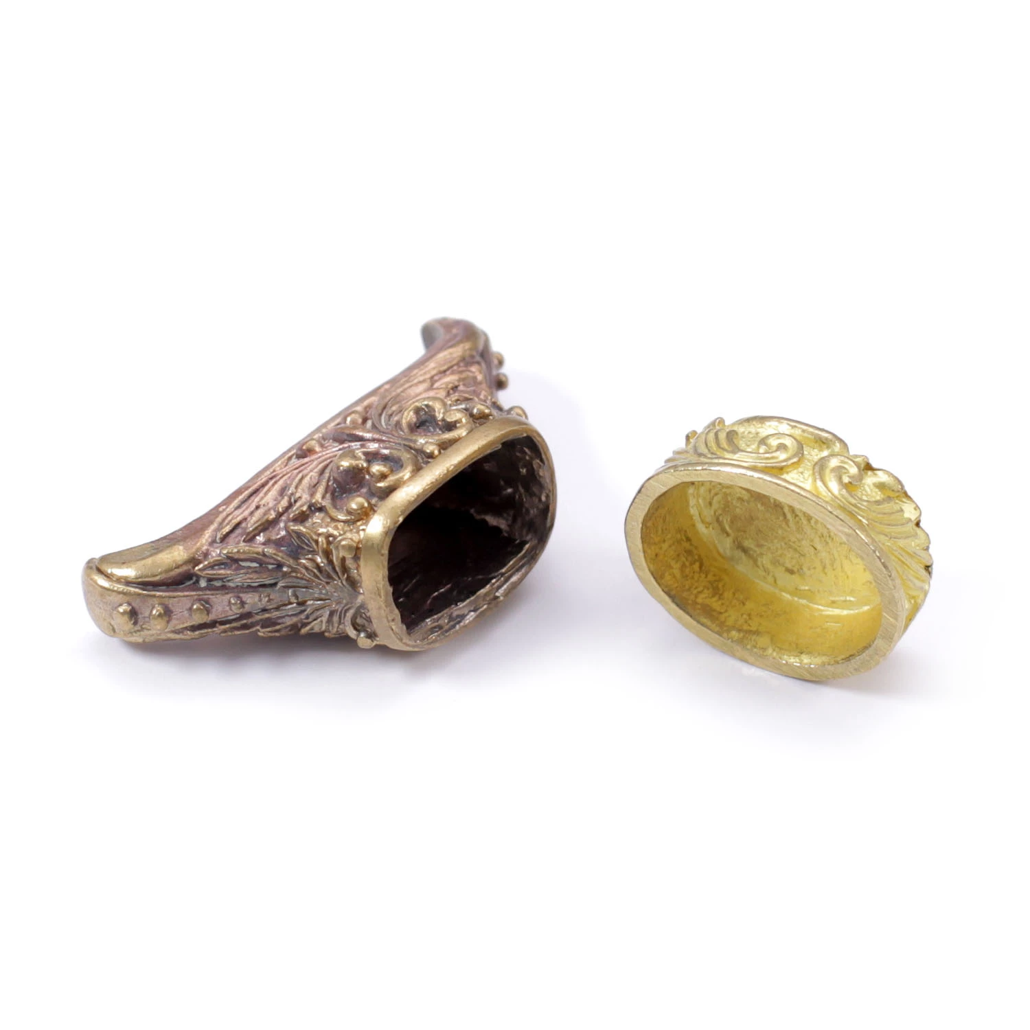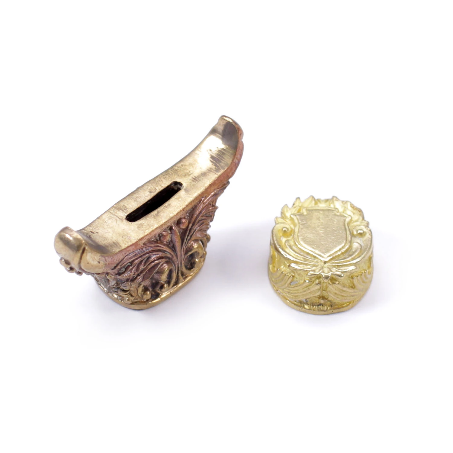 This is an engraved pommel and guard set that can be used to complete a custom hidden tang dagger style design. These parts are a matched set, and include decorative scroll work on both parts. The guard features a (.650″ x .110″) slot, which can be easily enlarged. Both guard and pommel feature deep slipover cavities for versatile fitting. These are a very high-quality, hand cast set!