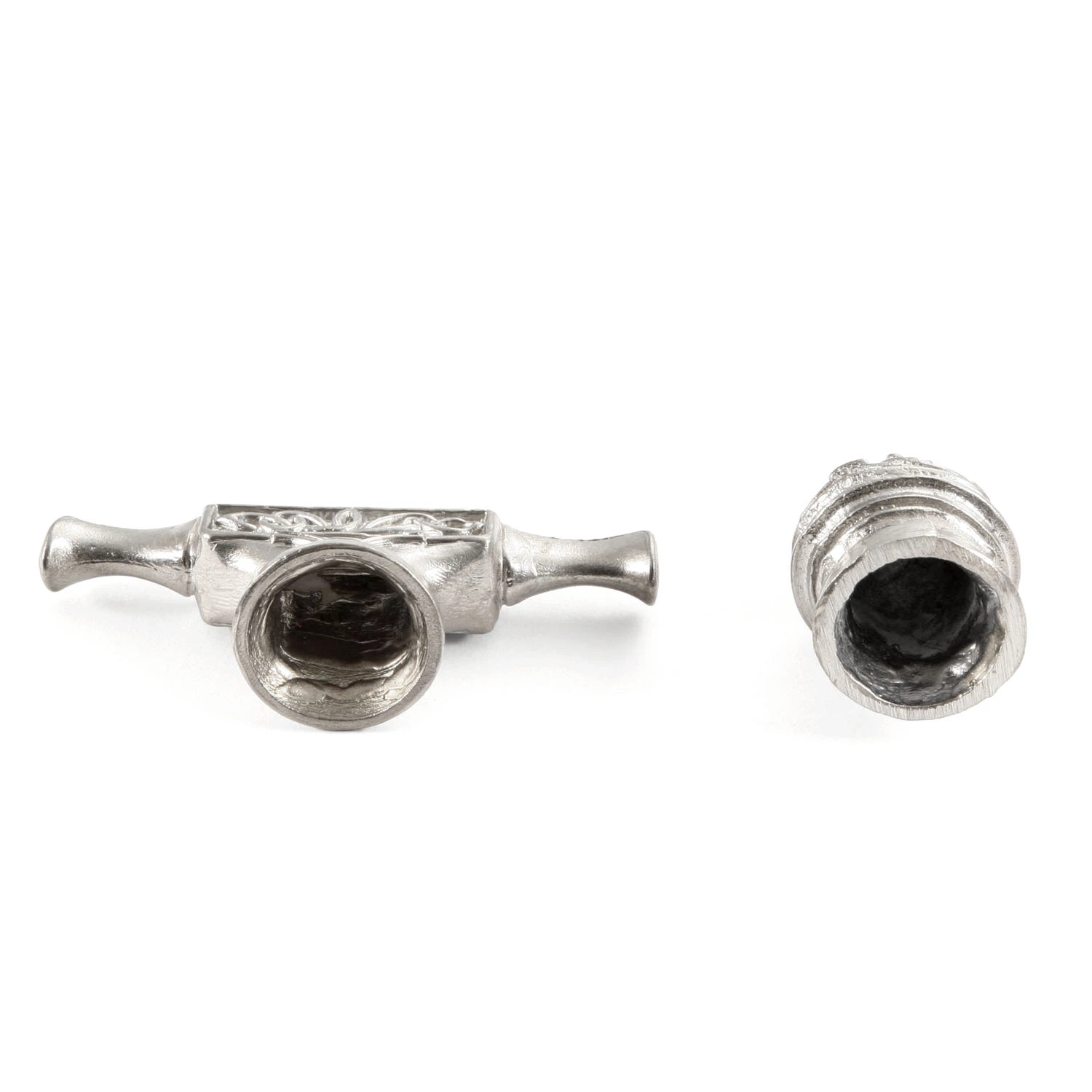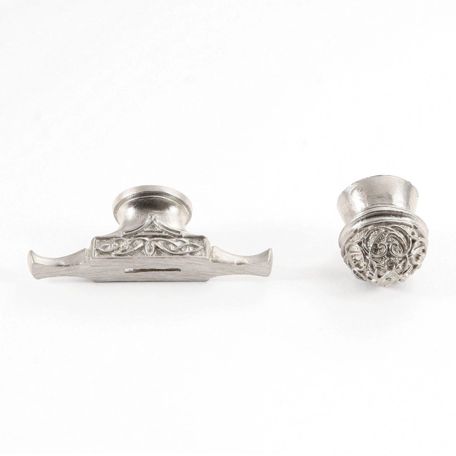 This is an engraved pommel and guard set that can be used to complete a custom hidden tang dagger style design. These parts are a matched set, and include decorative scroll work on both parts. The guard features a (.650″ x .065″) slot, which can be easily enlarged. Both guard and pommel feature deep slipover cavities for versatile fitting. These are a very high-quality, hand cast set!
