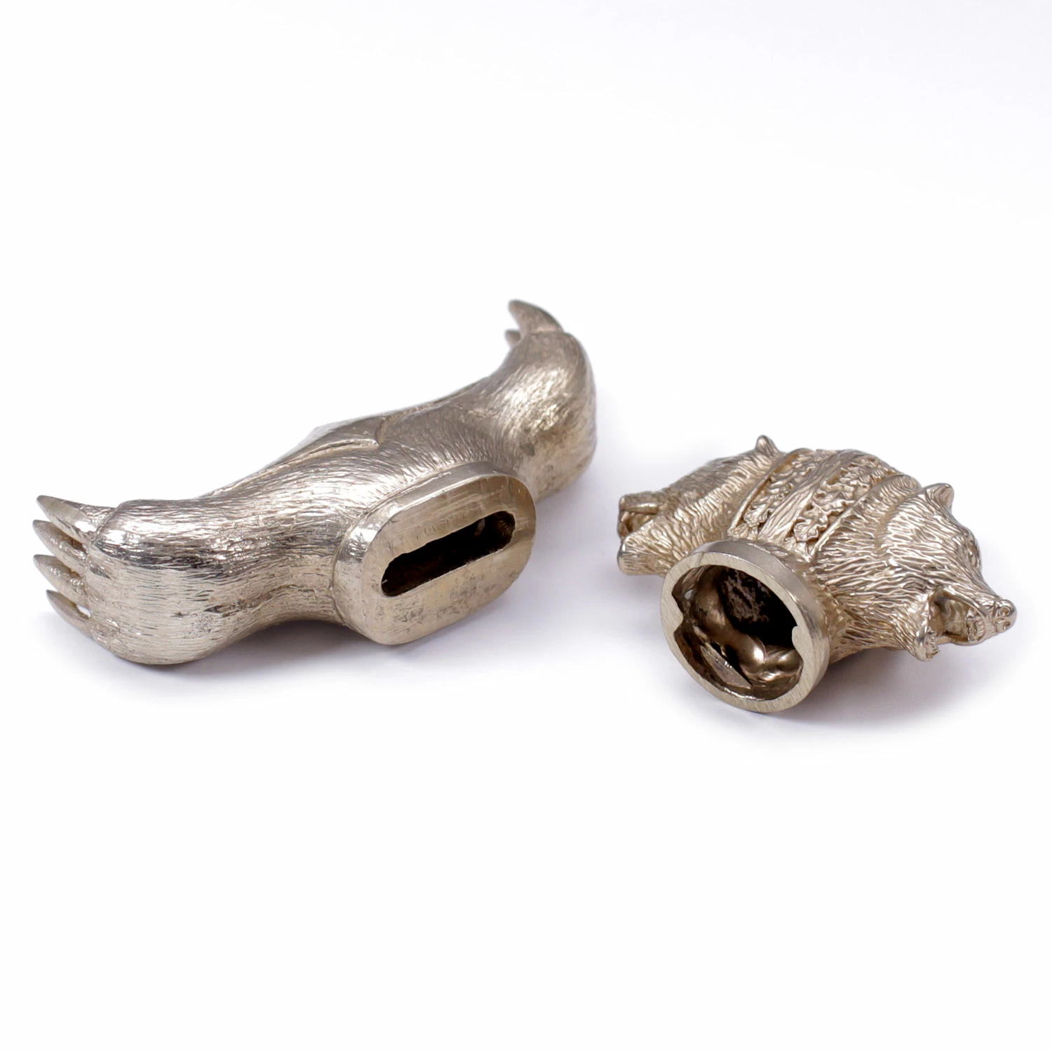 This is a cast pommel and guard set that can be used to complete a custom hidden tang fixed blade sword design. These parts are a matched set and include decorative bear heads and claws. The guard features a tang slot which can be easily enlarged. Both guard and pommel feature slipover cavities for versatile fitting. These are a very high-quality, hand-cast set!
