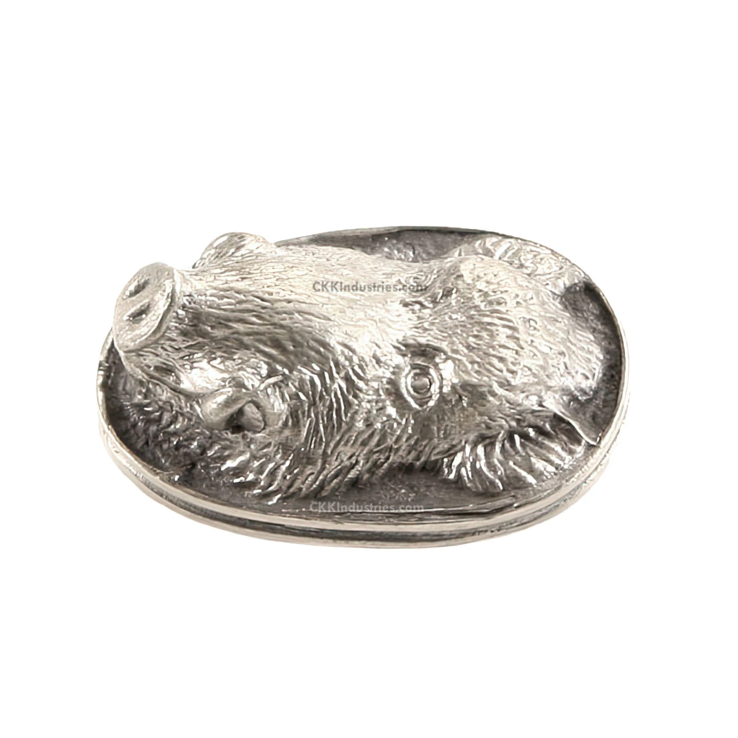 This is a decorative nickel silver pommel used to close (and hold) the handle on a fixed blade knife. This model features an engraved wild boar motif. This buttcap can be adapted to work with most hidden tang handle designs. Additional material has been left on bottom and outer edge for finish-sanding and shaping. These are very high quality and will professionally dress-out any custom knife handle.