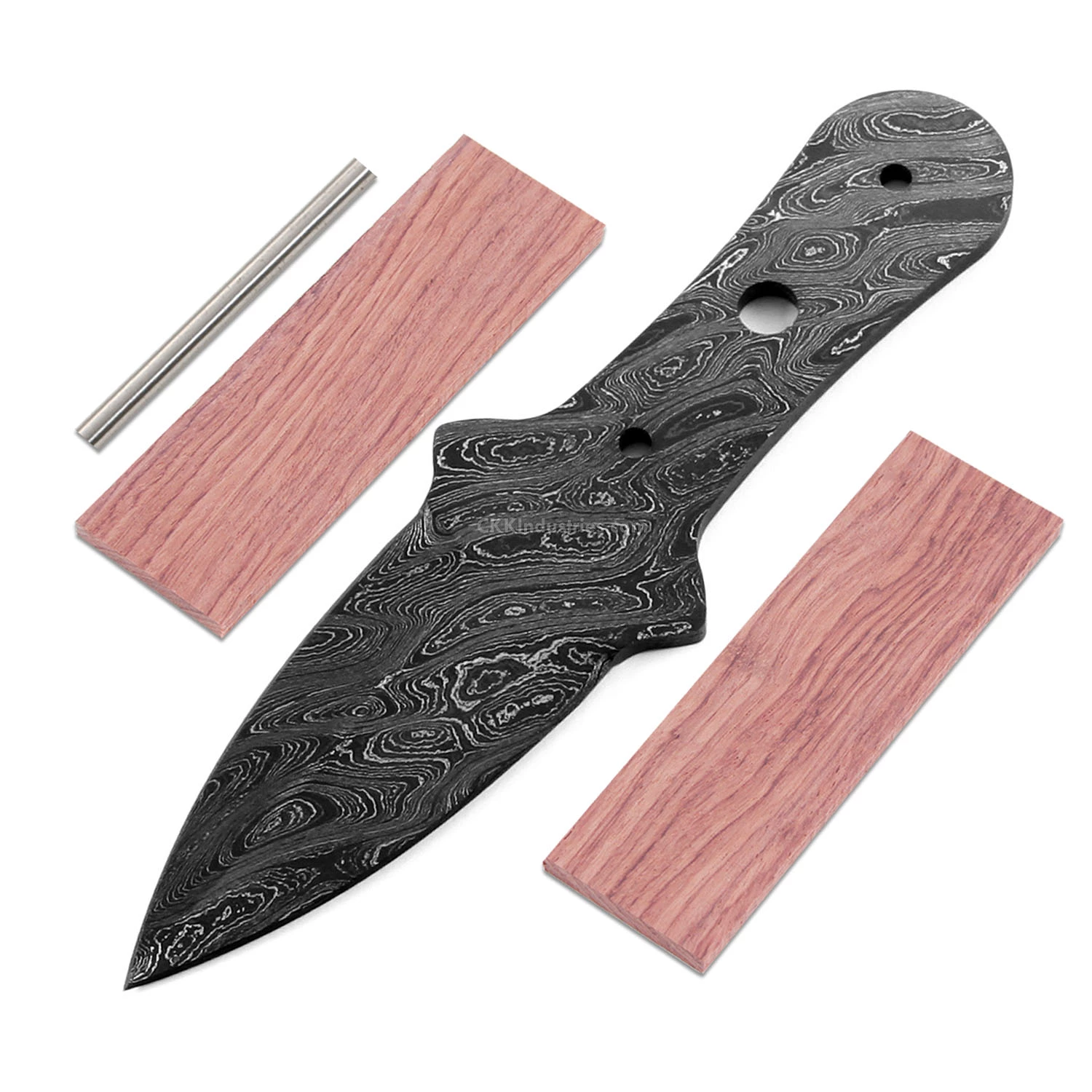 This damascus dagger knife kit design is called the “Pygmy Dagger”. It is a USA Made carbon steel damascus fixed blade knife blank that is hollow-ground and ready to build. This dagger blade blank model is small enough to “hide away”, and will make a fantastic personal protection knife. It will also serve very well as a collectible gift project. This damascus dagger blade blank has a blade length of 2.625 inches and an overall length of 5.50 inches. Ground on both sides, the blade is 1.25 inches wide. This design features (2) 0.125 inch through-holes for handle construction (stainless steel pinstock included) with a 0.250 inch hole for an optional decorative center pin. The tang holes can be modified with ease to work with larger pinstock, or with threaded fasteners.