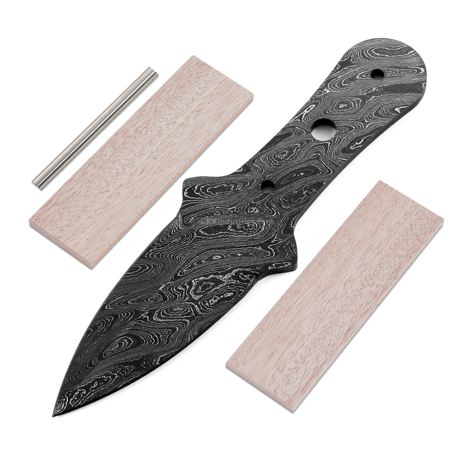 This damascus dagger knife kit design is called the “Pygmy Dagger”. It is a USA Made carbon steel damascus fixed blade knife blank that is hollow-ground and ready to build. This dagger blade blank model is small enough to “hide away”, and will make a fantastic personal protection knife. It will also serve very well as a collectible gift project. This damascus dagger blade blank has a blade length of 2.625 inches and an overall length of 5.50 inches. Ground on both sides, the blade is 1.25 inches wide. This design features (2) 0.125 inch through-holes for handle construction (stainless steel pinstock included) with a 0.250 inch hole for an optional decorative center pin. The tang holes can be modified with ease to work with larger pinstock, or with threaded fasteners.