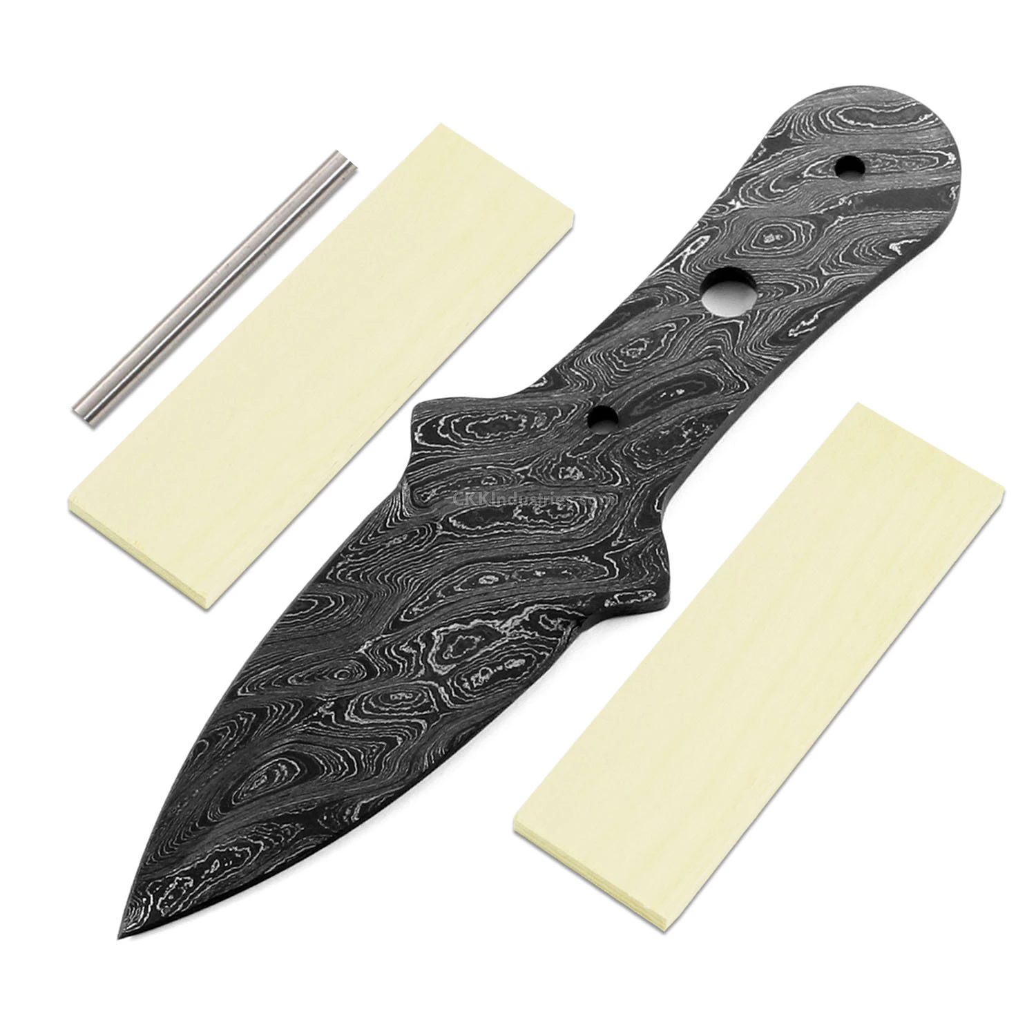 This damascus dagger knife kit design is called the “Pygmy Dagger”. It is a USA Made carbon steel damascus fixed blade knife blank that is hollow-ground and ready to build. This dagger blade blank model is small enough to “hide away”, and will make a fantastic personal protection knife. It will also serve very well as a collectible gift project. This damascus dagger blade blank has a blade length of 2.625 inches and an overall length of 5.50 inches. Ground on both sides, the blade is 1.25 inches wide. This design features (2) 0.125 inch through-holes for handle construction (stainless steel pinstock included) with a 0.250 inch hole for an optional decorative center pin. The tang holes can be modified with ease to work with larger pinstock, or with threaded fasteners.