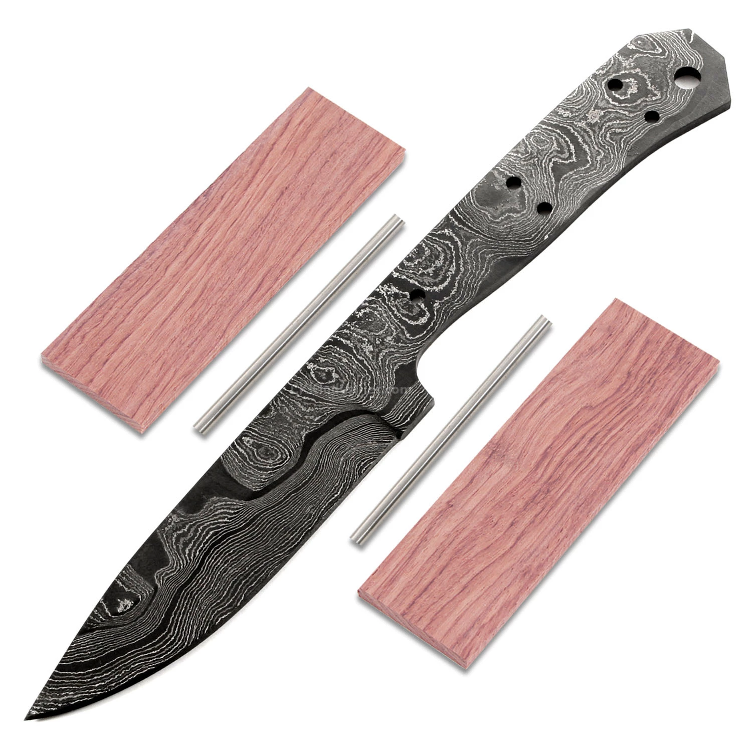 This damascus full tang knife making kit design is called the “Range Rambler”. It is a USA Made carbon steel damascus fixed blade knife blank that is hollow-ground and ready to build. This full tang knife kit model makes a fantastic personal carry hunter or utility knife. This damascus blade blank has a blade length of 4.00 inches and an overall length of 8.56 inches. Ground on both sides, the blade is 1.0625 inches wide. This design features (5) .125″ through-holes for handle construction (stainless steel pinstock included), with a .240 inch thong hole (tubing not included) for an optional lanyard. The tang holes can be modified with ease to work with larger pinstock, or with threaded fasteners. Please see our handle fastener sections for more options.