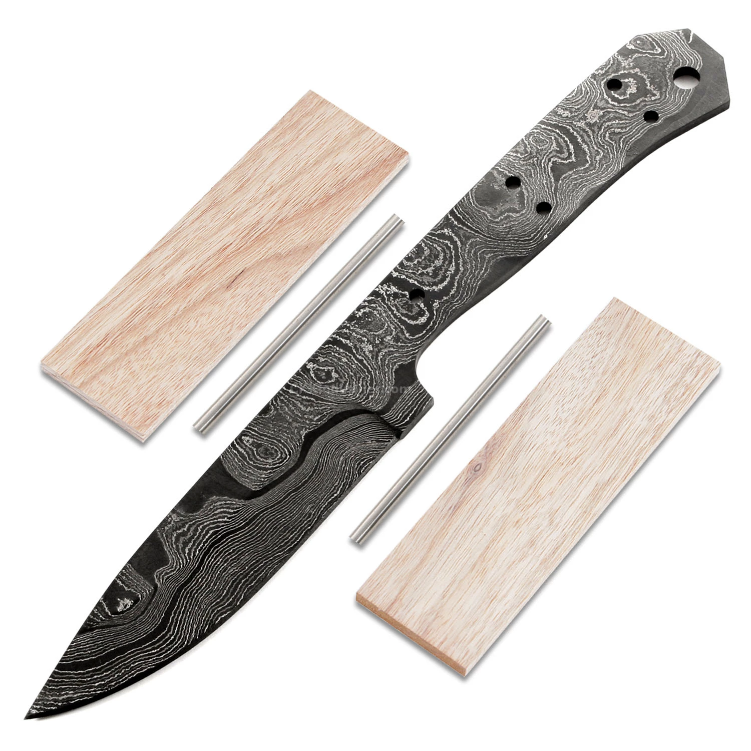 This damascus full tang knife making kit design is called the “Range Rambler”. It is a USA Made carbon steel damascus fixed blade knife blank that is hollow-ground and ready to build. This full tang knife kit model makes a fantastic personal carry hunter or utility knife. This damascus blade blank has a blade length of 4.00 inches and an overall length of 8.56 inches. Ground on both sides, the blade is 1.0625 inches wide. This design features (5) .125″ through-holes for handle construction (stainless steel pinstock included), with a .240 inch thong hole (tubing not included) for an optional lanyard. The tang holes can be modified with ease to work with larger pinstock, or with threaded fasteners. Please see our handle fastener sections for more options.