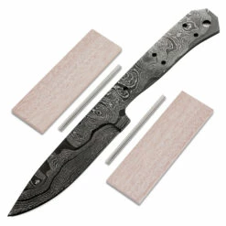 This damascus full tang knife making kit design is called the “Range Rambler”. It is a USA Made carbon steel damascus fixed blade knife blank that is hollow-ground and ready to build. This full tang knife kit model makes a fantastic personal carry hunter or utility knife. This damascus blade blank has a blade length of 4.00 inches and an overall length of 8.56 inches. Ground on both sides, the blade is 1.0625 inches wide. This design features (5) .125″ through-holes for handle construction (stainless steel pinstock included), with a .240 inch thong hole (tubing not included) for an optional lanyard. The tang holes can be modified with ease to work with larger pinstock, or with threaded fasteners. Please see our handle fastener sections for more options.
