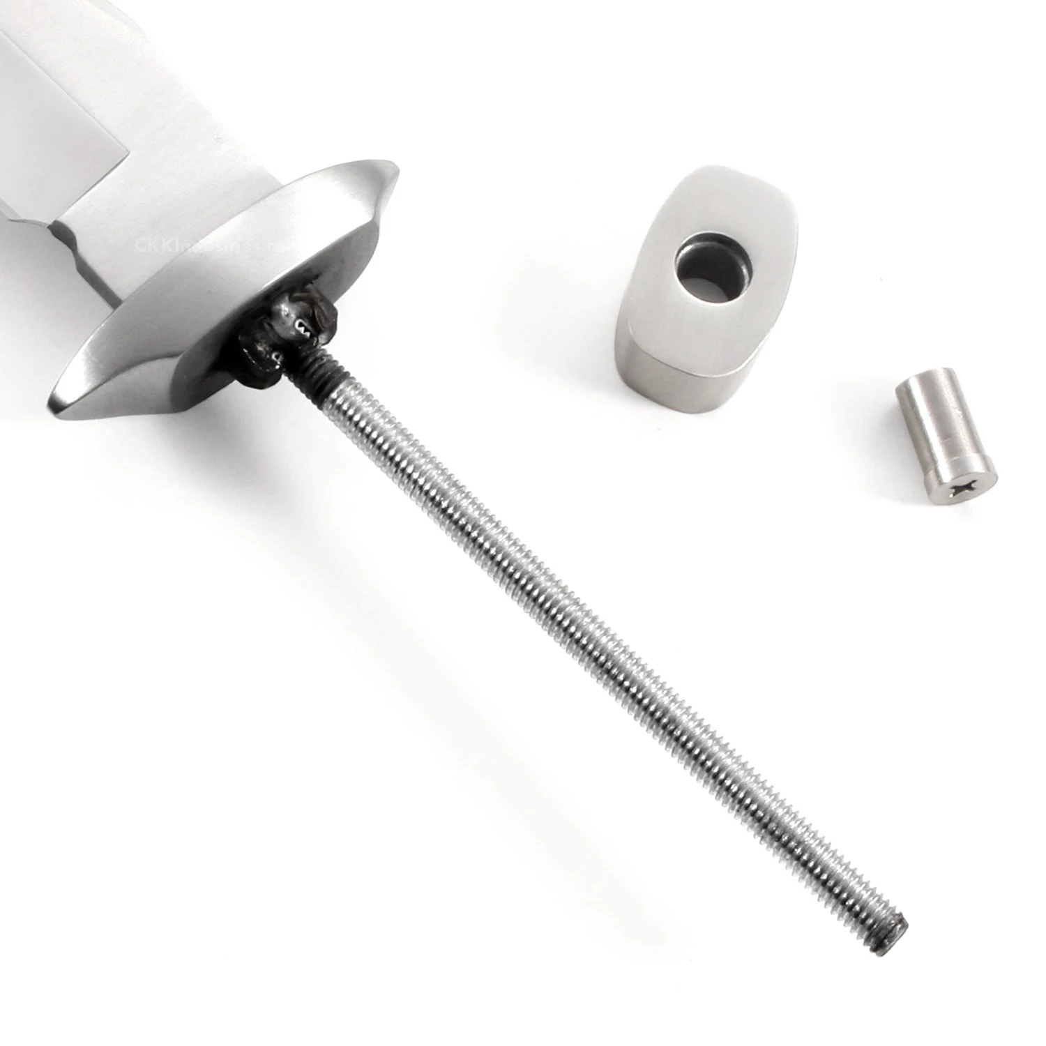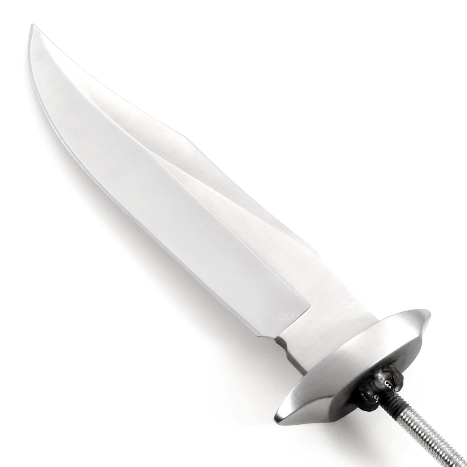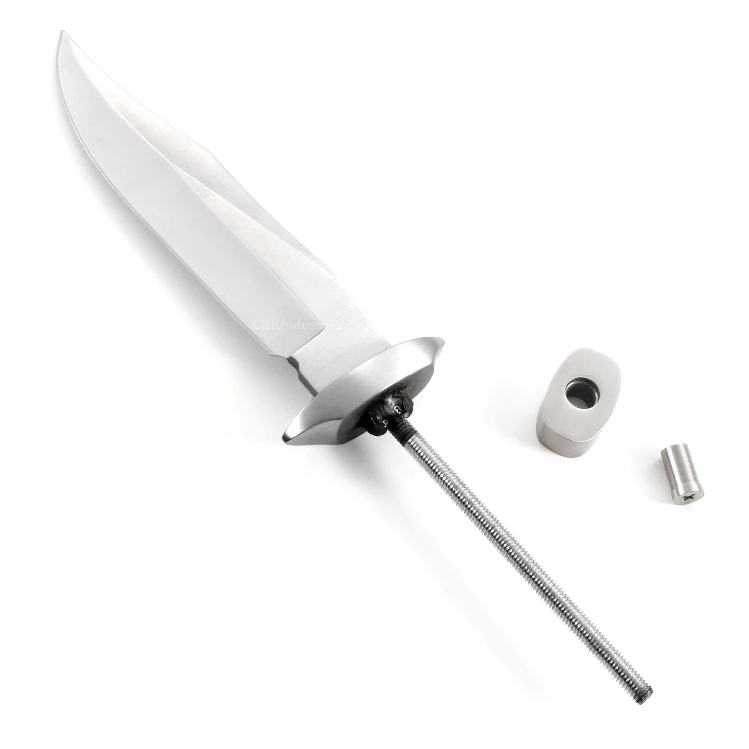 This is a classic take on the 11 inch hidden tang blade blank design. Complete with stainless steel front guard, rear butt cap and tang nut, this hidden tang knife making kit model features a trailing-point false-edge over a hollow-grind. This trailing point blade blank design has a high satin finish on a .177 thick, 5-1/2″ inch blade. You can finish this kit in the traditional solid handle fashion, or scallop the handle and add palm swell, use stacked washers, etc. The sky is the limit with this type of handle design!