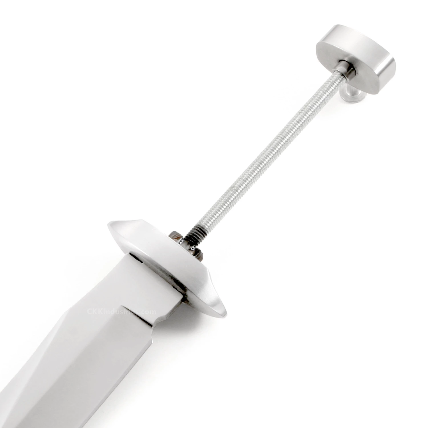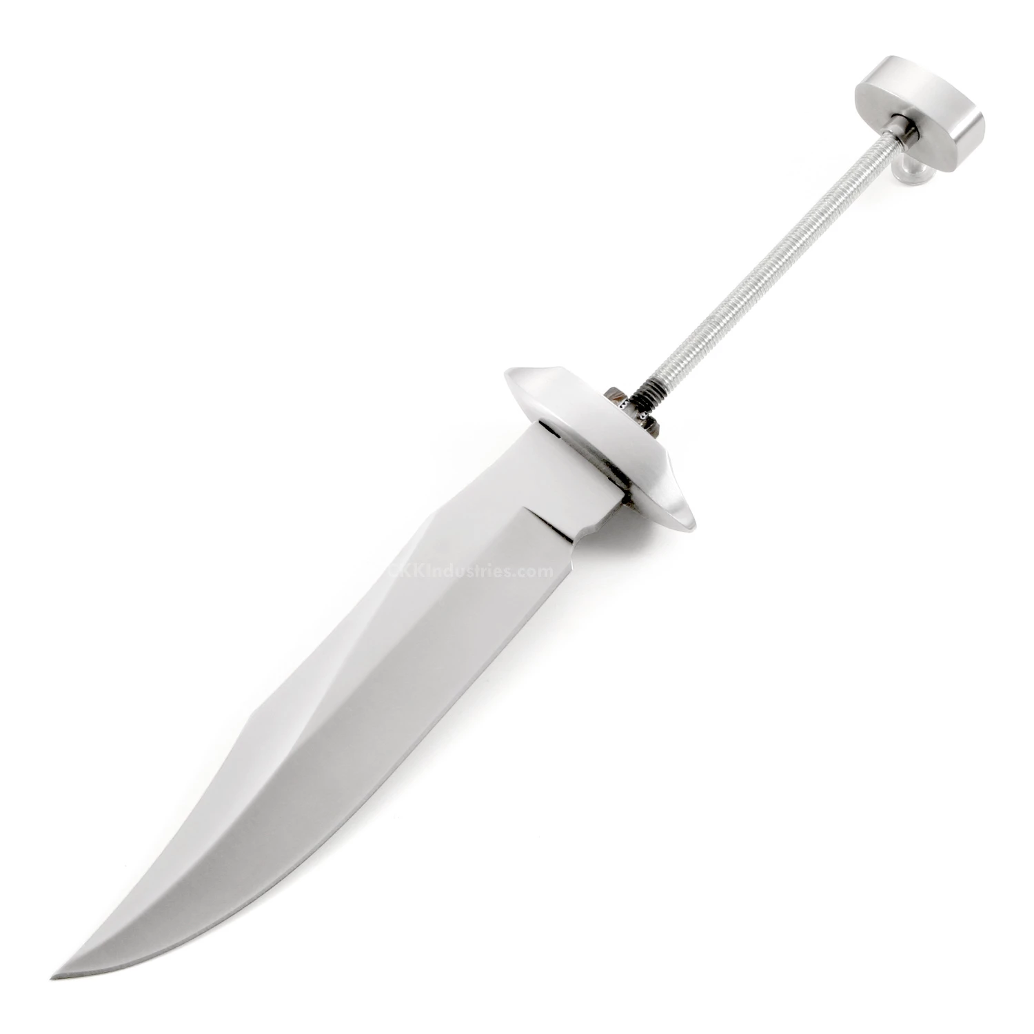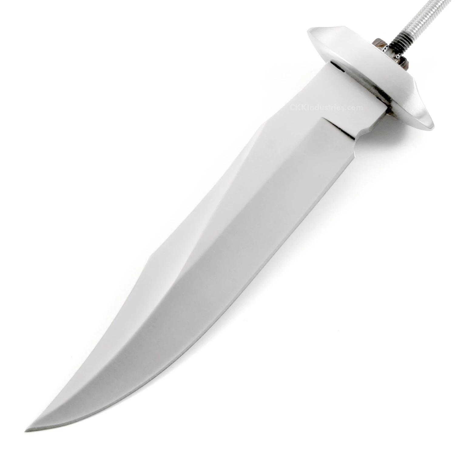 This is a classic take on the 11 inch hidden tang blade blank design. Complete with stainless steel front guard, rear butt cap and tang nut, this hidden tang knife making kit model features a trailing-point false-edge over a hollow-grind. This trailing point blade blank design has a high satin finish on a .177 thick, 5-1/2″ inch blade. You can finish this kit in the traditional solid handle fashion, or scallop the handle and add palm swell, use stacked washers, etc. The sky is the limit with this type of handle design!