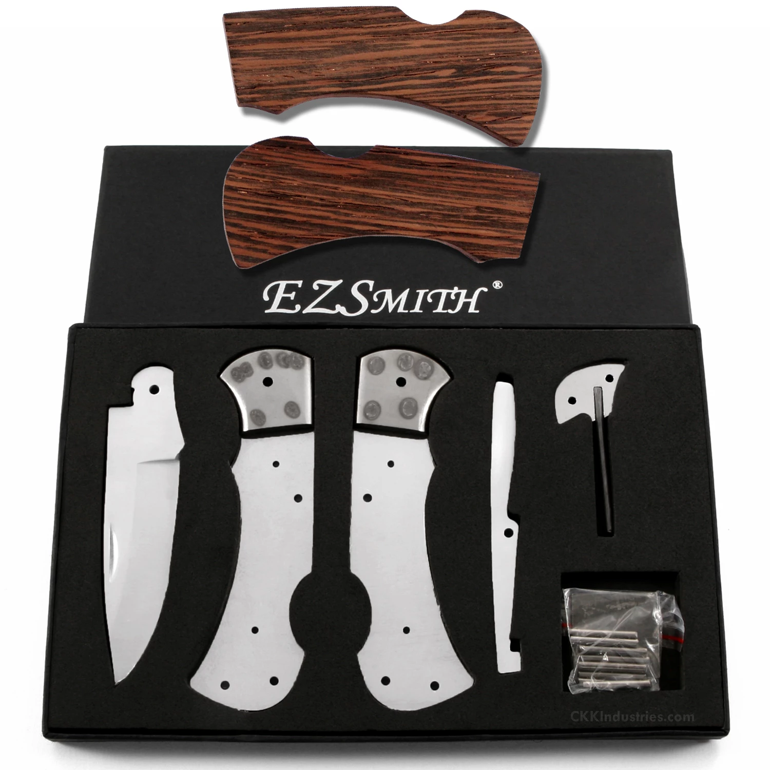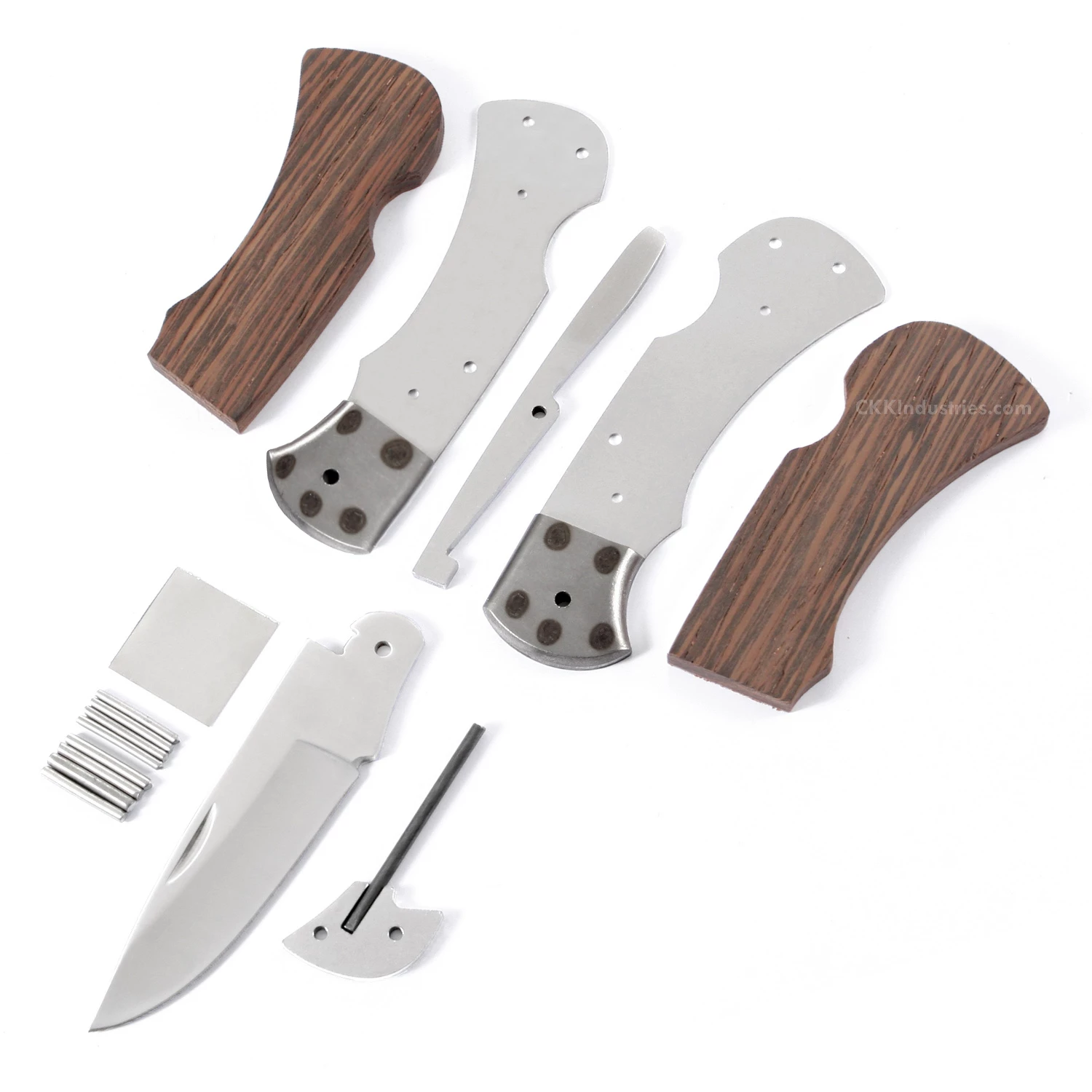 The Ranger Lockback folding knife kit is a full-sized folder and has a 2 7/8 inch satin finished flat ground blade made from 440C stainless steel. It has been cryogenically treated for additional toughness and edge holding performance. The bolsters, handle pins and liners are made of stainless steel. This lockback folding knife kit design is 4 1/4 inches closed and is 7 inches overall when open. This version is the combo kit. It comes with all of the basic kit parts, plus pre-machined Wenge handle scales to simplify the completion process. Add a touch of proper finishing, and you will create a fabulous folding knife that you’ll be proud to own and carry.