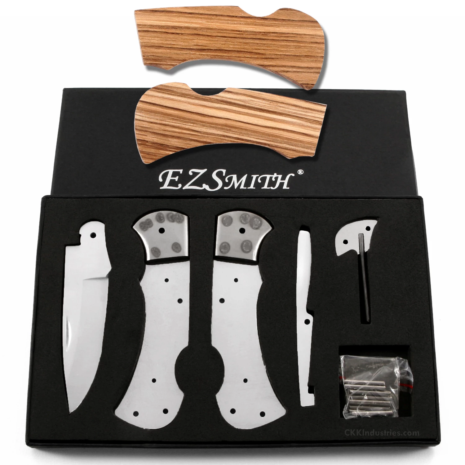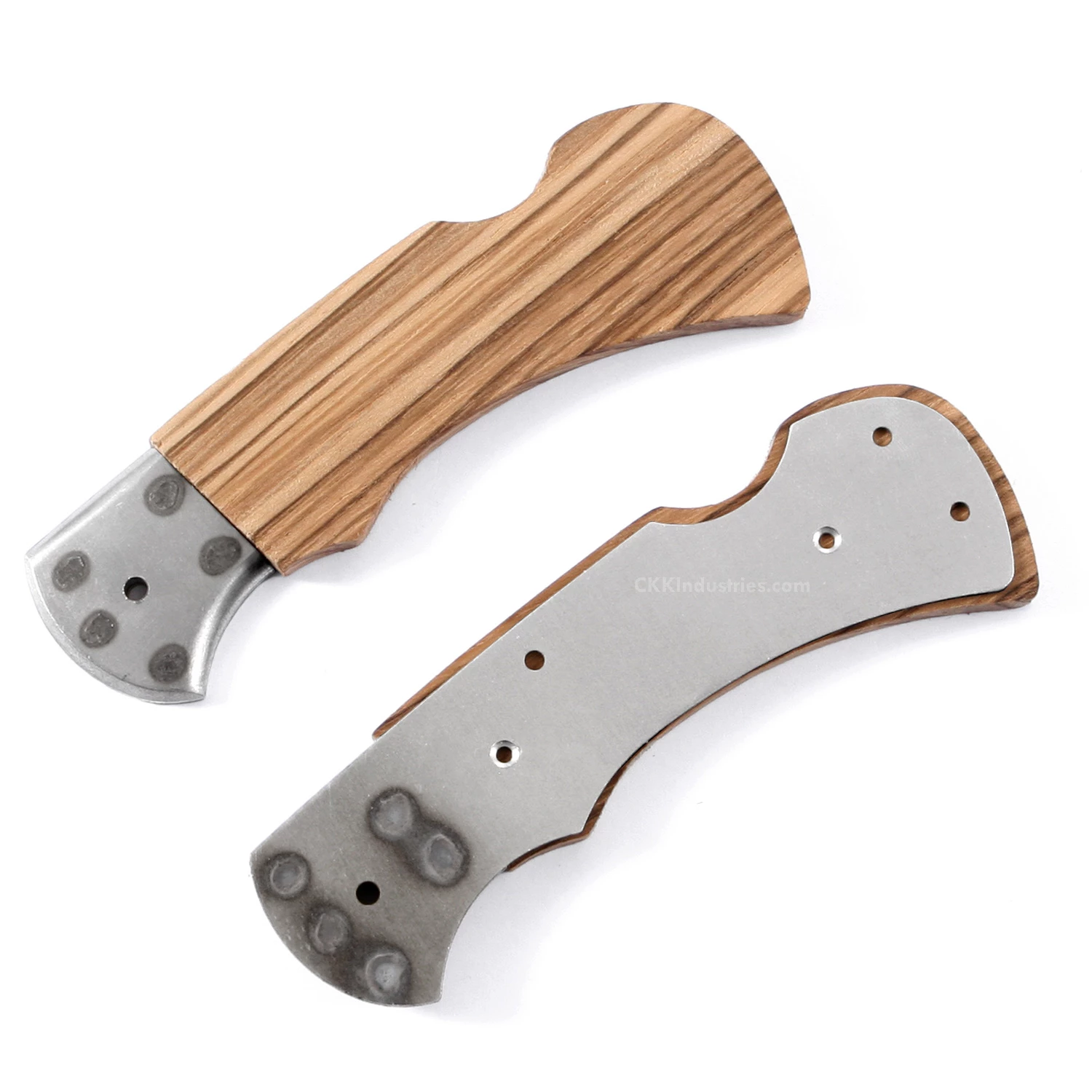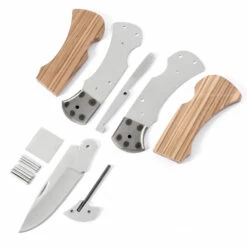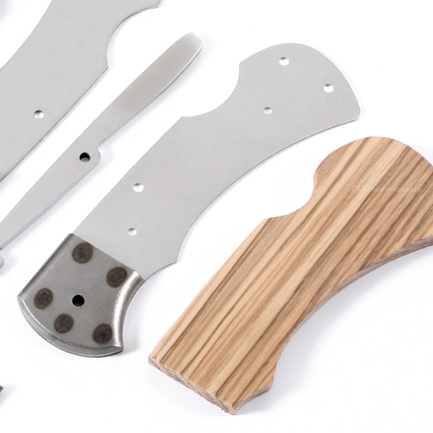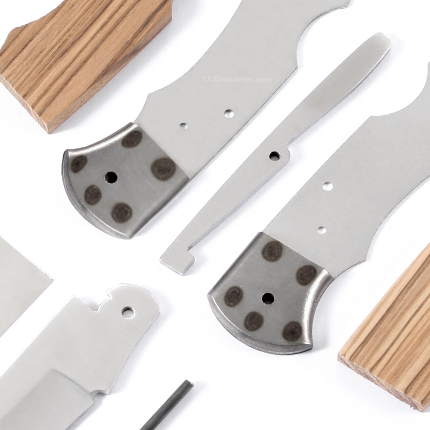 The Ranger Lockback folding knife kit is a full-sized folder and has a 2 7/8 inch satin finished flat ground blade made from 440C stainless steel. It has been cryogenically treated for additional toughness and edge holding performance. The bolsters, handle pins and liners are made of stainless steel. This lockback folding knife kit design is 4 1/4 inches closed and is 7 inches overall when open. This version is the combo kit. It comes with all of the basic kit parts, plus pre-machined Zebrawood handle scales to simplify the completion process. Add a touch of proper finishing, and you will create a fabulous folding knife that you’ll be proud to own and carry.