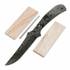 This damascus knife design is called the “Rebel Skinner”. It is a USA Made carbon steel damascus fixed blade knife blank that is hollow-ground and ready to build. This damascus steel model is a medium carry size and fits well in the hand. The Rebel Skinner blade blank has a blade length of 3.375 inches and an overall length of 8.0625 inches. Ground on both sides, the blade is .875 inches wide. This design features (3) .125 inch through-holes for handle construction (stainless steel pinstock included). The tang holes can be modified to work with larger pinstock, or with threaded fasteners. Please see our Knife Making Tools and Parts categories for more handle fastening options. This version of the Rebel Skinner is the combo kit. It comes with the Rebel Skinner blade plus Canarywood handle scales and stainless steel pinstock to simplify the completion process. This is a great project blade for a weekend knife making session. Spend some quality workshop time with this skinning knife kit and enjoy the fun of custom knife making and customization.