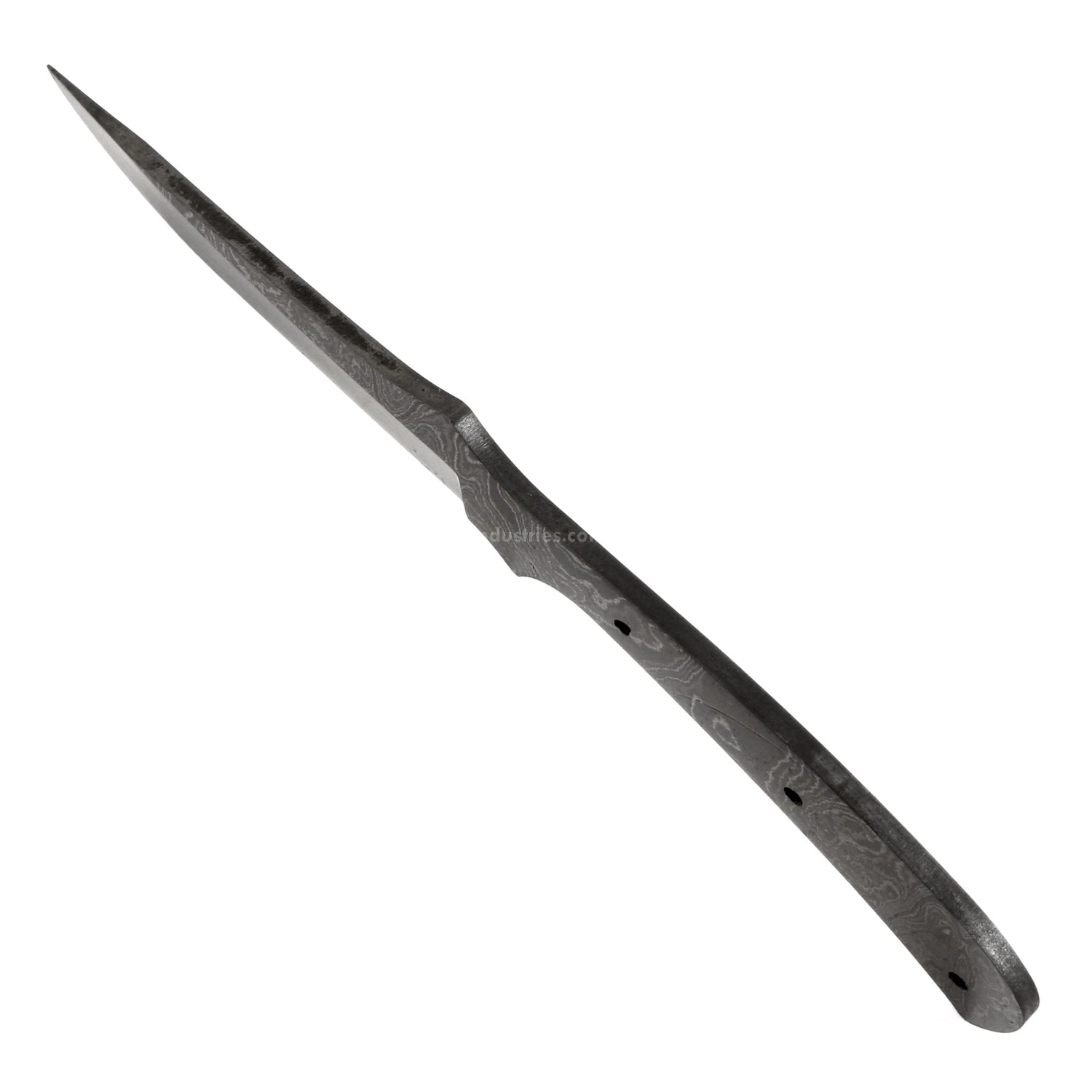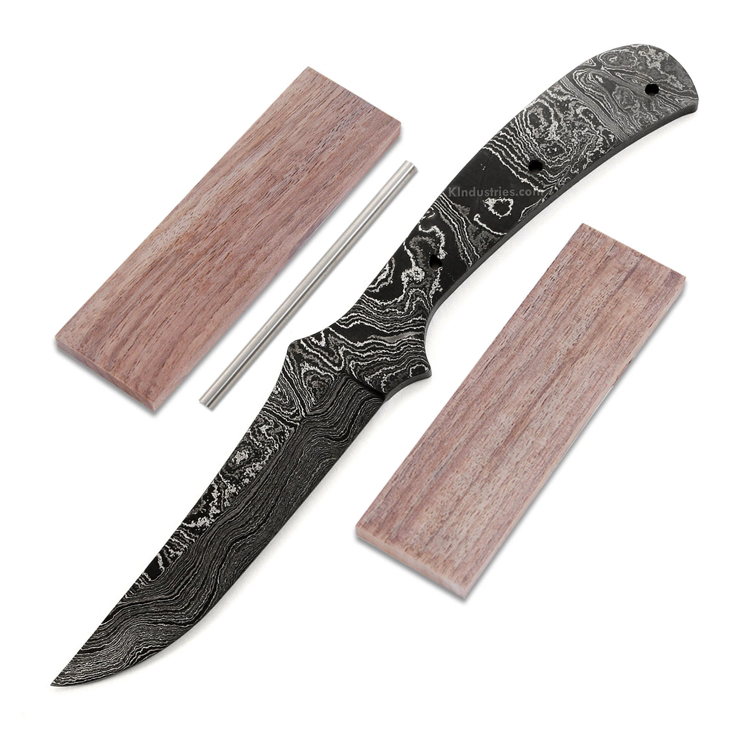 This damascus knife design is called the “Rebel Skinner”. It is a USA Made carbon steel damascus fixed blade knife blank that is hollow-ground and ready to build. This damascus steel model is a medium carry size and fits well in the hand. The Rebel Skinner blade blank has a blade length of 3.375 inches and an overall length of 8.0625 inches. Ground on both sides, the blade is .875 inches wide. This design features (3) .125 inch through-holes for handle construction (stainless steel pinstock included). The tang holes can be modified to work with larger pinstock, or with threaded fasteners. Please see our Knife Making Tools and Parts categories for more handle fastening options. This version of the Rebel Skinner is the combo kit. It comes with the Rebel Skinner blade plus Walnut handle scales and stainless steel pinstock to simplify the completion process. This is a great project blade for a weekend knife making session. Spend some quality workshop time with this skinning knife kit and enjoy the fun of custom knife making and customization.
