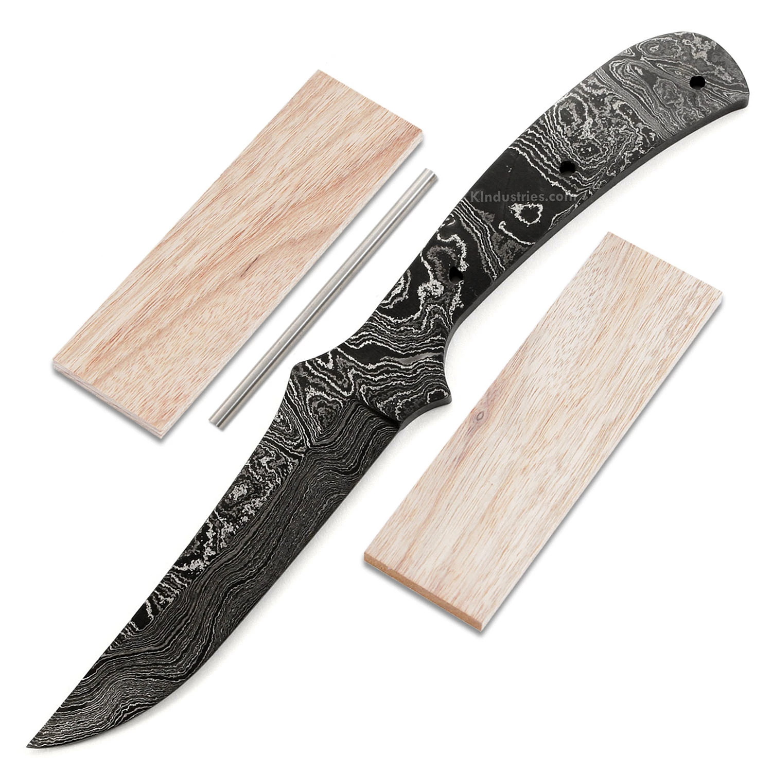 This damascus knife design is called the “Rebel Skinner XL”. It is a USA Made carbon steel damascus fixed blade knife blank that is hollow-ground and ready to build. This damascus steel model is slightly larger than its smaller stablemate, but still has a medium carry size and fits well in the hand. The Rebel Skinner blade blank has a blade length of 3.87 inches and an overall length of 8.50 inches. Ground on both sides, the blade is .875 inches wide. This design features (3) .125 inch through-holes for handle construction (stainless steel pinstock included). The tang holes can be modified to work with larger pinstock, or with threaded fasteners. Please see our Knife Making Tools and Parts categories for more handle fastening options. This version of the Rebel Skinner XL is the combo kit. It comes with the Rebel Skinner XL blade plus Canarywood handle scales and stainless steel pinstock to simplify the completion process. This is a great project blade for a weekend knife making session. Spend some quality workshop time with this skinning knife kit and enjoy the fun of custom knife making and customization.
