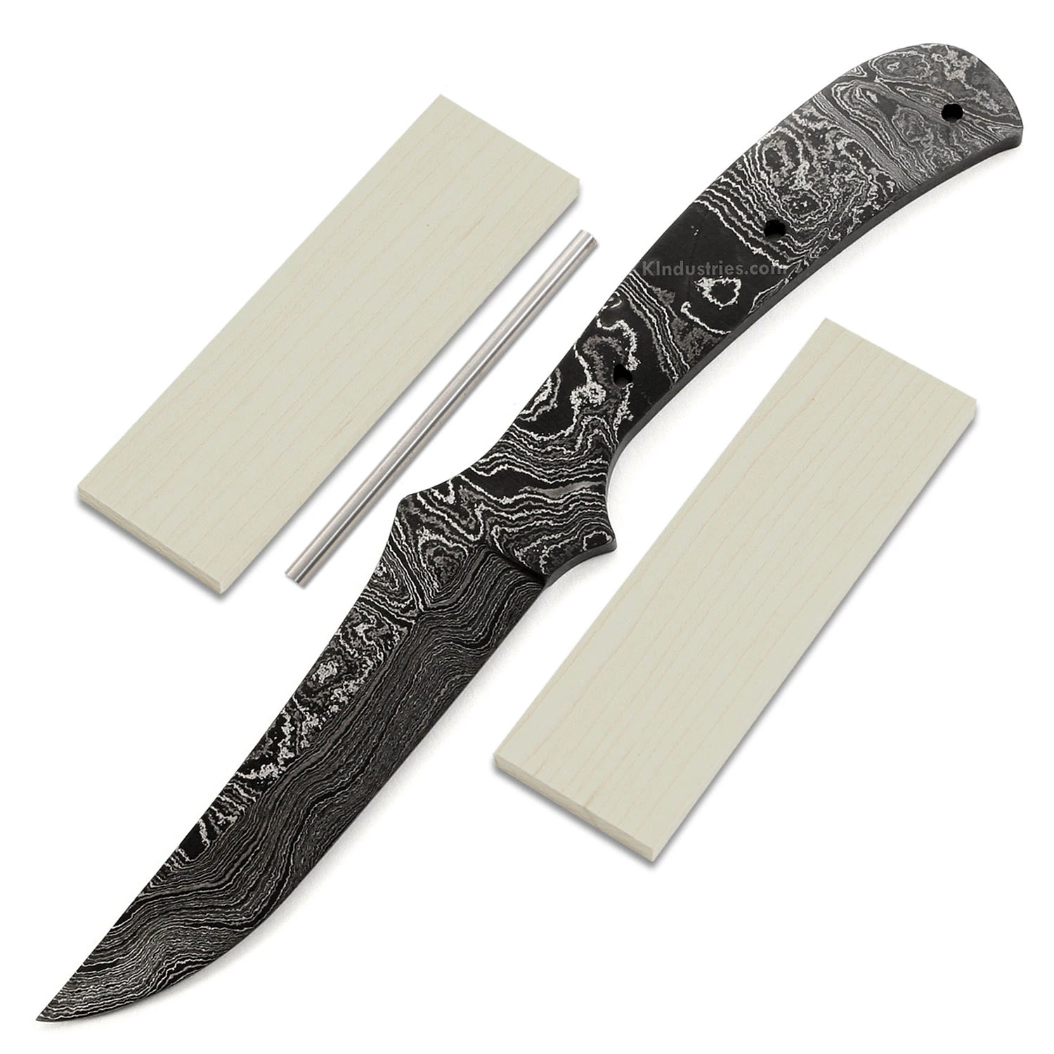 This damascus knife design is called the “Rebel Skinner XL”. It is a USA Made carbon steel damascus fixed blade knife blank that is hollow-ground and ready to build. This damascus steel model is slightly larger than its smaller stablemate, but still has a medium carry size and fits well in the hand. The Rebel Skinner blade blank has a blade length of 3.87 inches and an overall length of 8.50 inches. Ground on both sides, the blade is .875 inches wide. This design features (3) .125 inch through-holes for handle construction (stainless steel pinstock included). The tang holes can be modified to work with larger pinstock, or with threaded fasteners. Please see our Knife Making Tools and Parts categories for more handle fastening options. This version of the Rebel Skinner XL is the combo kit. It comes with the Rebel Skinner XL blade plus Curly Maple handle scales and stainless steel pinstock to simplify the completion process. This is a great project blade for a weekend knife making session. Spend some quality workshop time with this skinning knife kit and enjoy the fun of custom knife making and customization.
