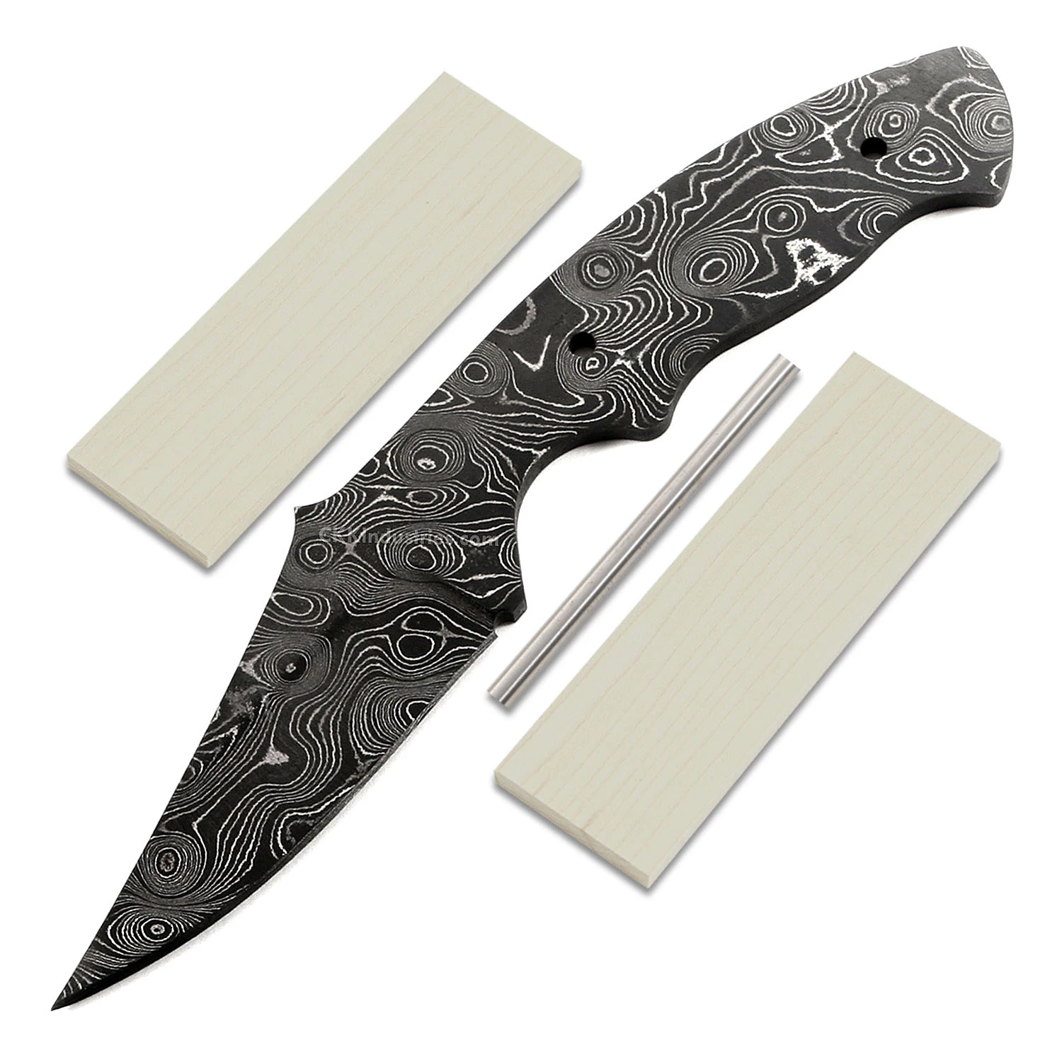This damascus utility knife kit design is called the “Reef Shark”. It is a USA Made carbon steel damascus fixed blade knife blank that is hollow-ground and ready to build. This damascus knife making kit model will make a fantastic skinning-utility knife, or considered as a collectible gift project. The Reef Shark has a blade length of 2.625 inches and an overall length of 6.875 inches. Ground on both sides, the blade is 1.00 inches wide. This damascus utility blade blank design features (2) 0.155 through-holes for handle construction (stainless steel pinstock included). The tang holes can be modified with ease to work with larger pinstock, or with threaded fasteners.
