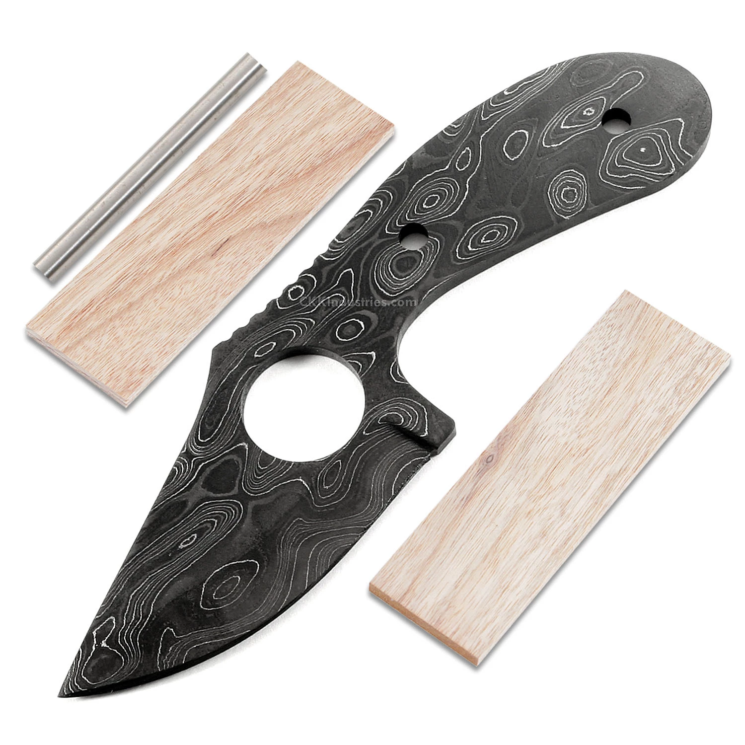 This ring grip knife blank design is called the “Ringeye Skinner”. It is a USA Made carbon steel damascus fixed blade knife blank that is hollow-ground and ready to build. This skinner blade blank model will make a fantastic personal hunter or skinning knife. The skinning knife making kit is excellent for sure gripping, creating a great feel in the hand when doing skinning work. With a blade length of 3.00 inches and an overall length of 6.43 inches, this design is a perfect size for skinning and utility chores. Ground on both sides, the Ringeye Skinner’s blade is 1.625 inches wide. This ring grip design features (2) 0.250 inch through-holes for handle construction (stainless steel pinstock included). The tang holes can be modified with ease to work with larger pinstock, or with threaded fasteners.