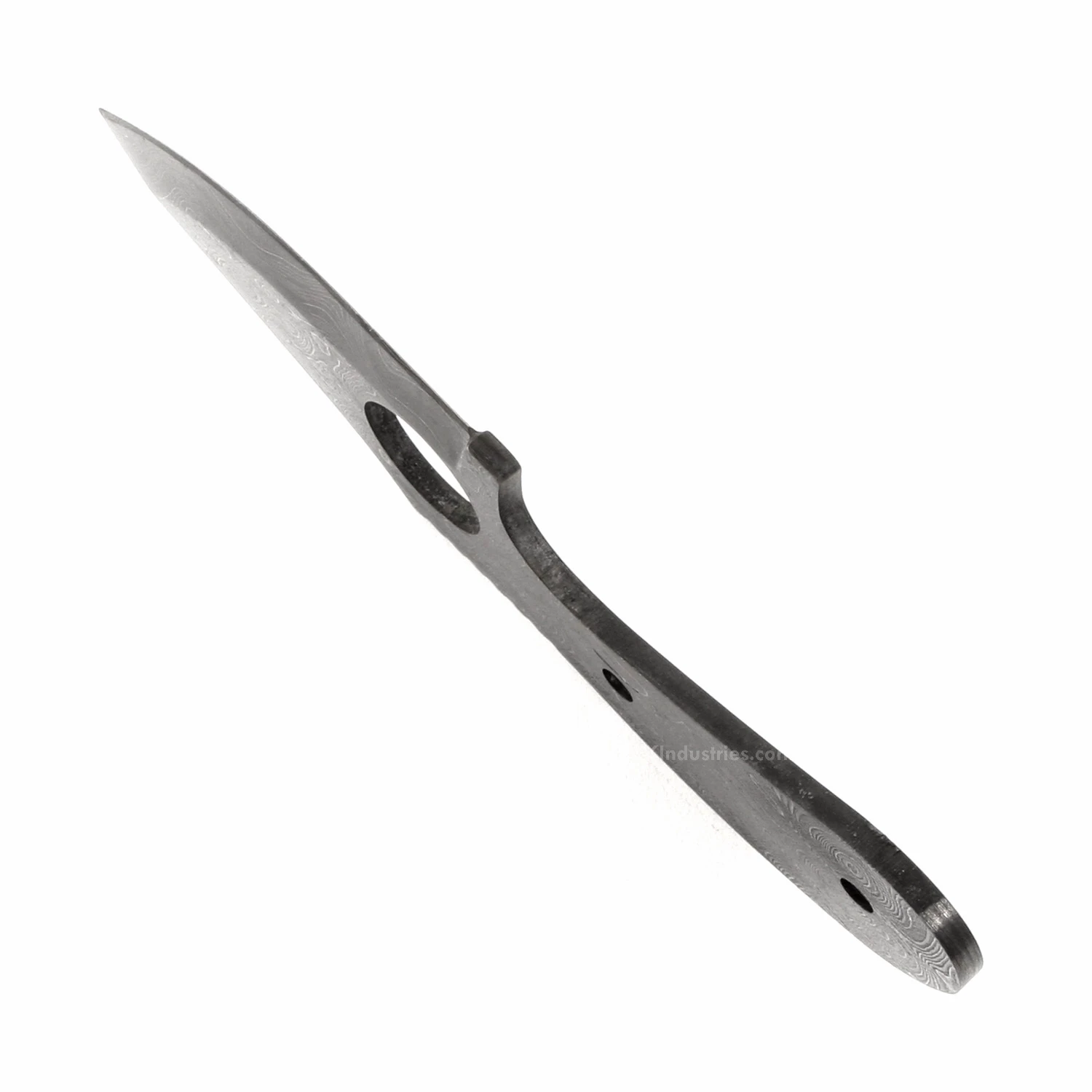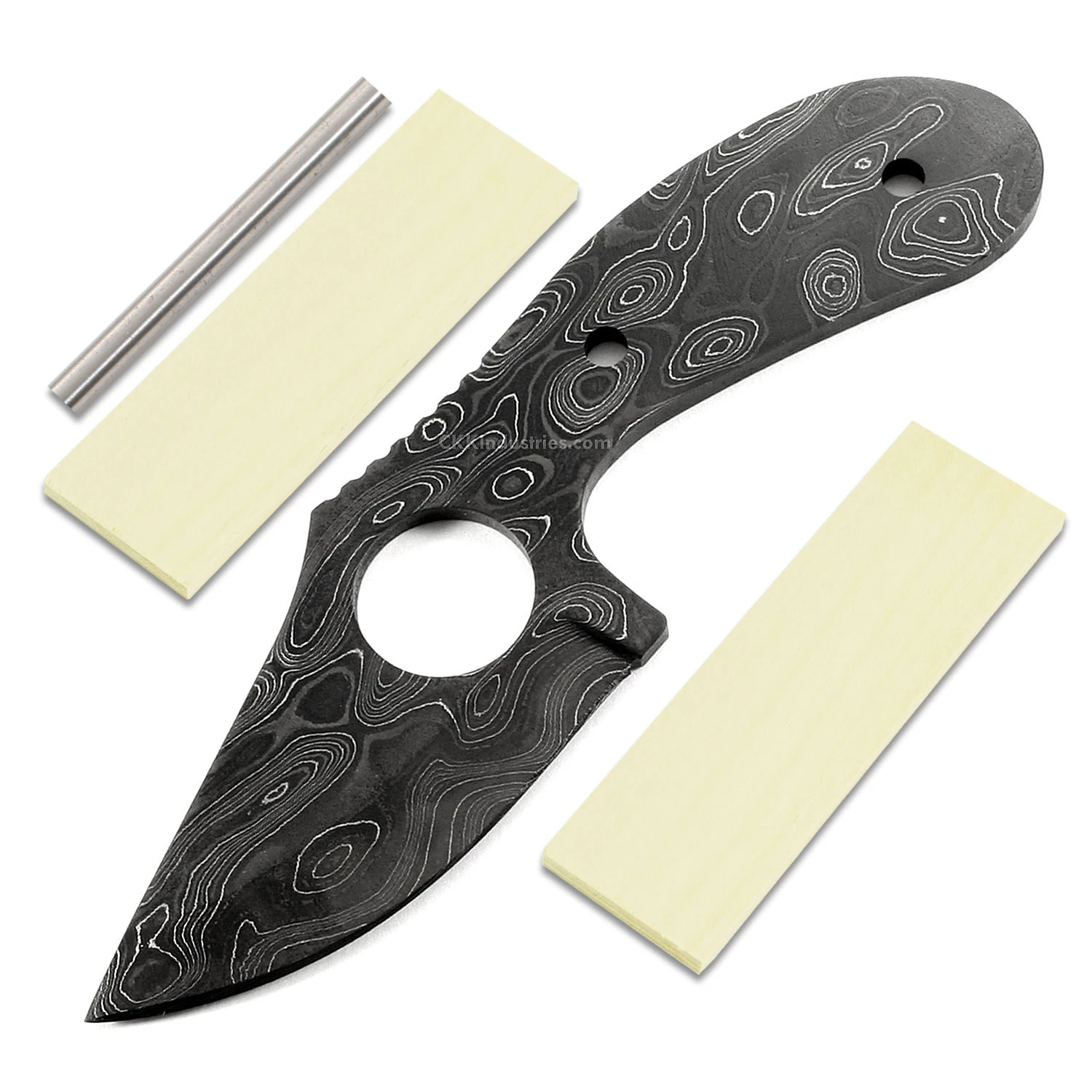 This ring grip knife blank design is called the “Ringeye Skinner”. It is a USA Made carbon steel damascus fixed blade knife blank that is hollow-ground and ready to build. This skinner blade blank model will make a fantastic personal hunter or skinning knife. The skinning knife making kit is excellent for sure gripping, creating a great feel in the hand when doing skinning work. With a blade length of 3.00 inches and an overall length of 6.43 inches, this design is a perfect size for skinning and utility chores. Ground on both sides, the Ringeye Skinner’s blade is 1.625 inches wide. This ring grip design features (2) 0.250 inch through-holes for handle construction (stainless steel pinstock included). The tang holes can be modified with ease to work with larger pinstock, or with threaded fasteners.