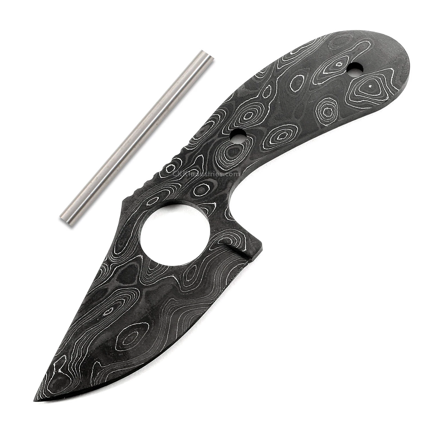 This ring grip knife blank design is called the “Ringeye Skinner”. It is a USA Made carbon steel damascus fixed blade knife blank that is hollow-ground and ready to build. This skinner blade blank model will make a fantastic personal hunter or skinning knife. The skinning knife making kit is excellent for sure gripping, creating a great feel in the hand when doing skinning work. With a blade length of 3.00 inches and an overall length of 6.43 inches, this design is a perfect size for skinning and utility chores. Ground on both sides, the Ringeye Skinner’s blade is 1.625 inches wide. This ring grip design features (2) 0.250 inch through-holes for handle construction (stainless steel pinstock included). The tang holes can be modified with ease to work with larger pinstock, or with threaded fasteners.